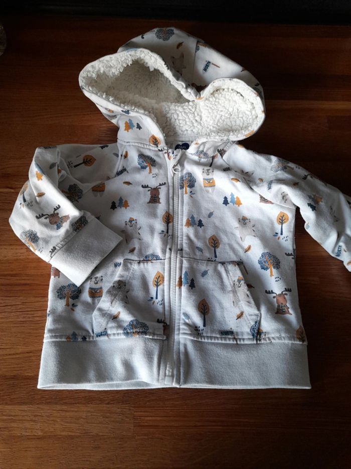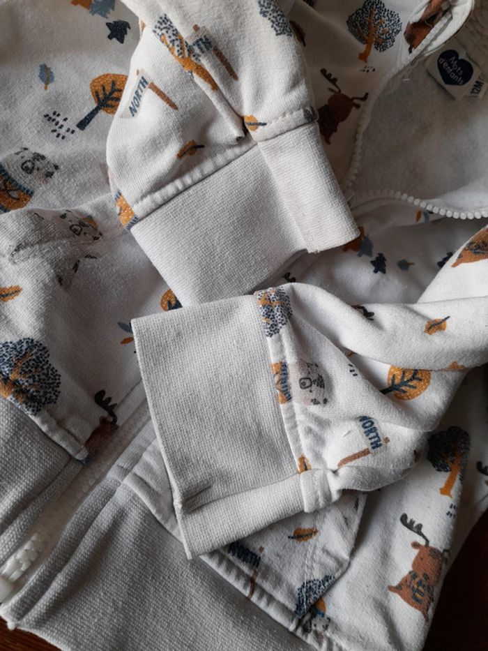 Veste zippé 12 mois mot d'enfants bon état légèrement tâcher aux niveaux des manches couleur blanc à motifs