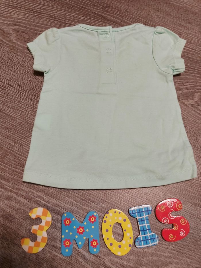 Ensemble 3 mois fille. *T-shirt bleu/vert. manches courtes. Ouverture totale par l'arrière par pressions. Motif cœur. Orchestra. * Legging blanc. Tex.
