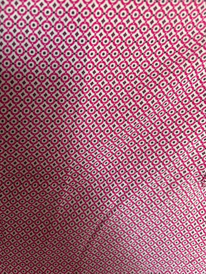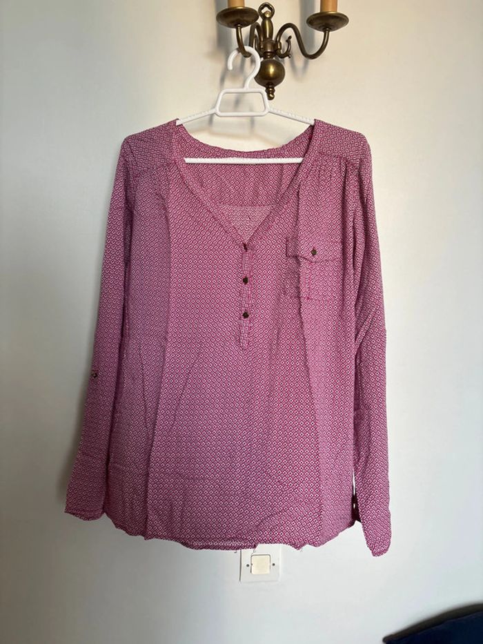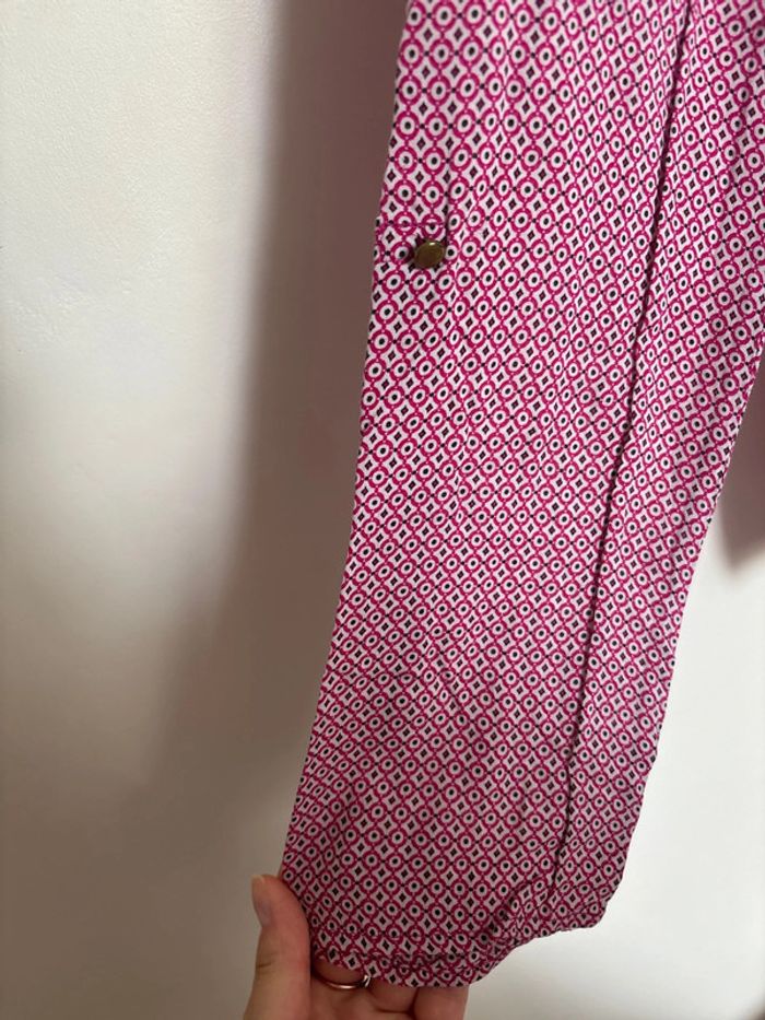 Blouse fluide de couleur rose à motifs noirs et blancs Possibilité de faire une blouse à manches 3/4 avec les boutons