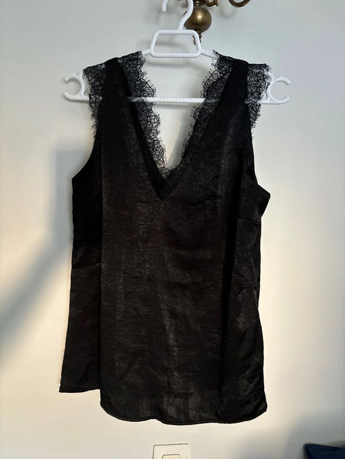 Debardeur noir effet satiné velour, décolleté en V avec de la dentelle Porté 1 ou 2 fois