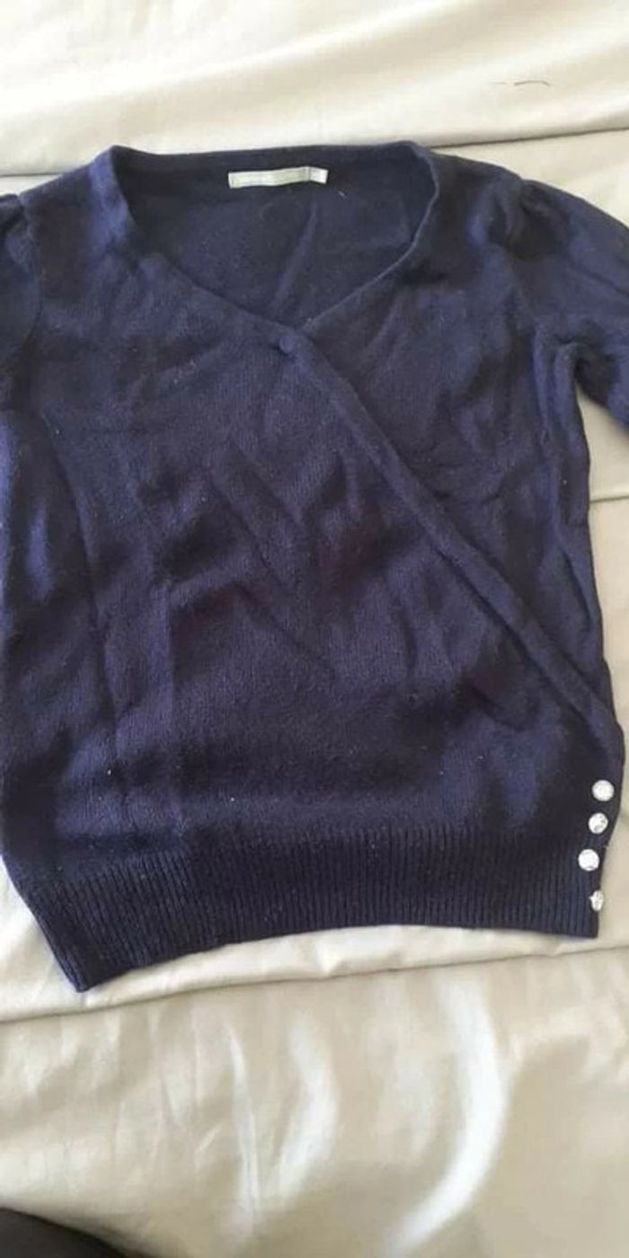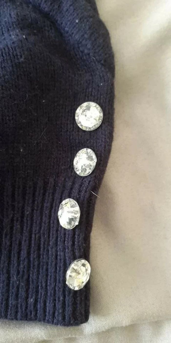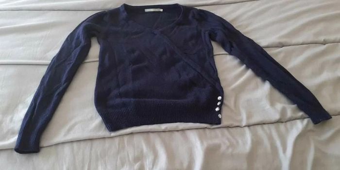 Pull avec boutons décoratifs en bas, porté quelques fois