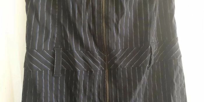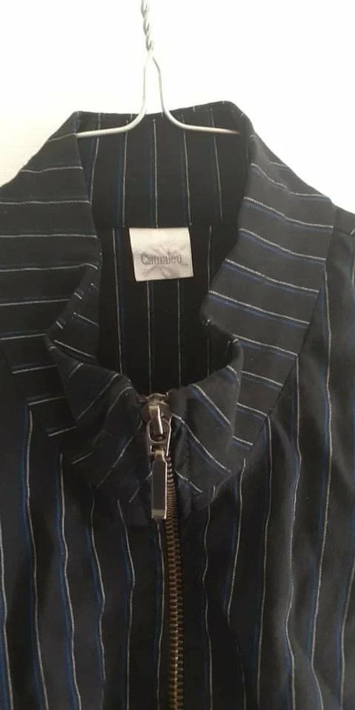 Robe Camaïeu convient à une taille 38 (plus l'étiquette de la taille) couleur noire avec de fines rayures bleues et blanches.