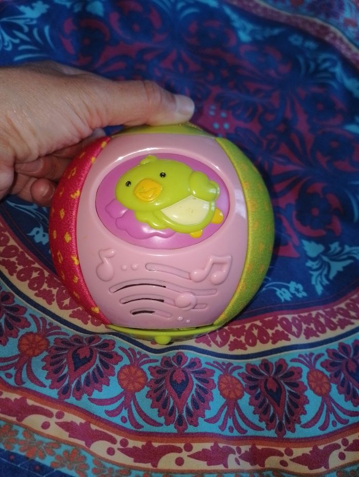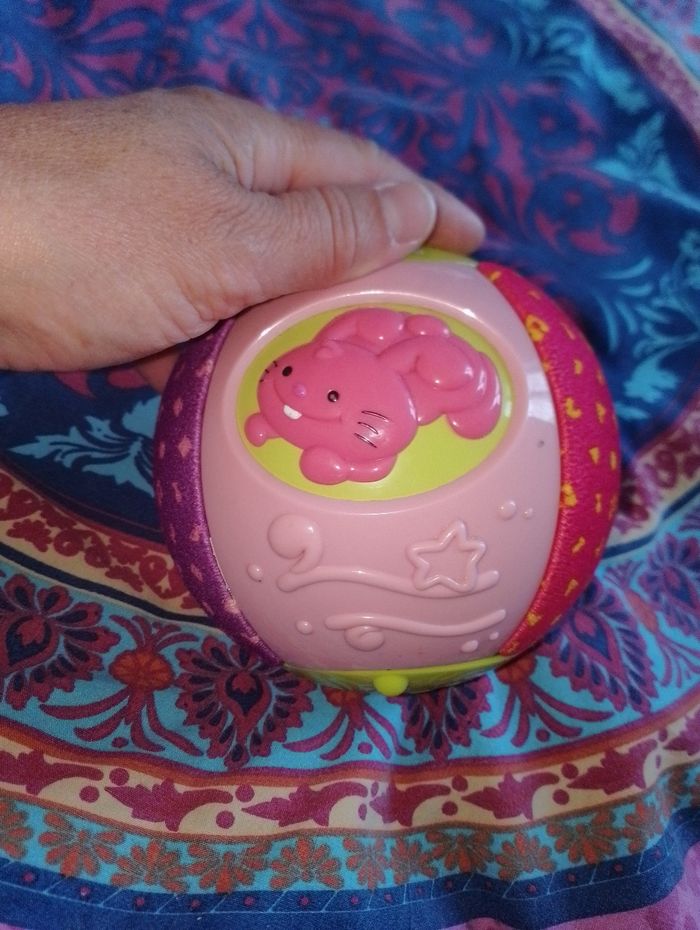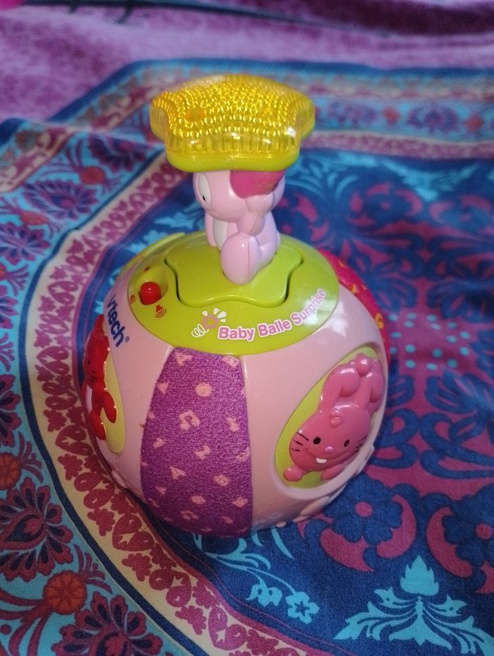 Baby balle surprise Vtech rose 6 - 24 mois Une balle surprise avec un petit chien qui surgit, parle, chante ou aboie ! Des touches animaux pour découvrir leur nom, leur cri et les couleurs 10 mélodies et 1 chanson Plein d'effets sonores et lumineux Détecteur de mouvements : la balle réagit dès qu'on la fait rouler Balle légère en plastique résistant avec bandes anti-chocs en tissu Réglage du volume sonore et arrêt automatique