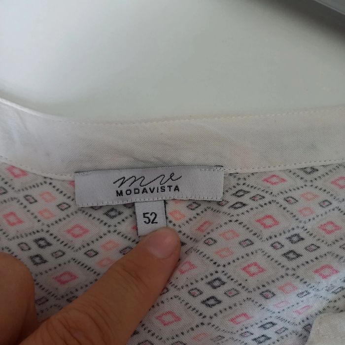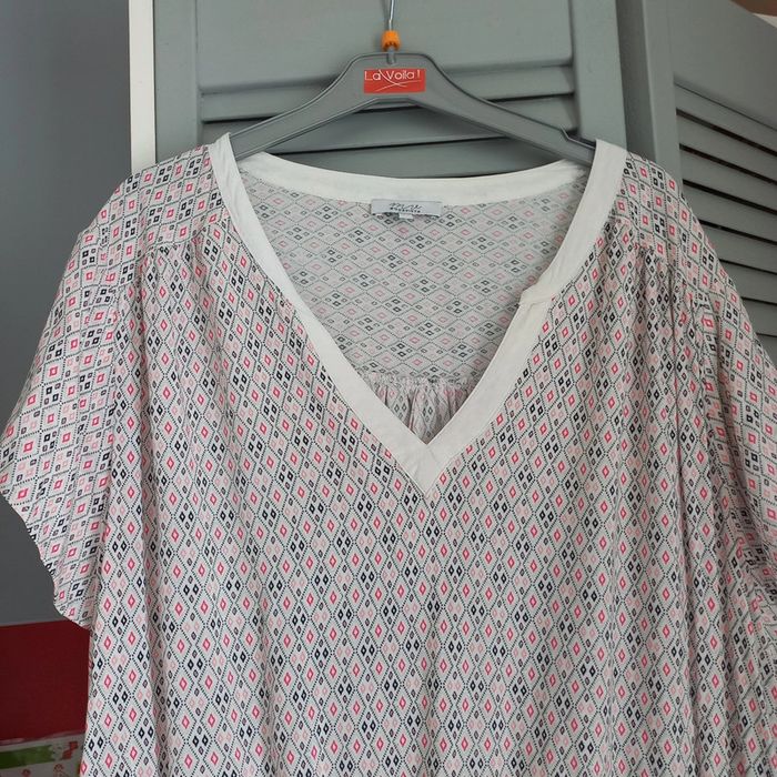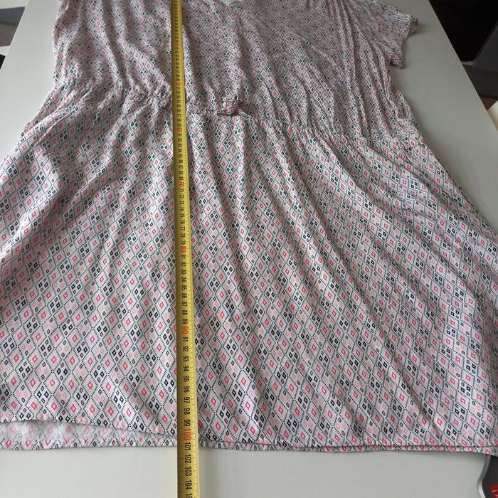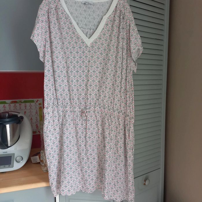 Robe blanche à petits motifs géométriques Noeuds à la taille et col v En parfait état hormis une petite tache derrière sous l élastique voir photo Modavista Taille 50/52