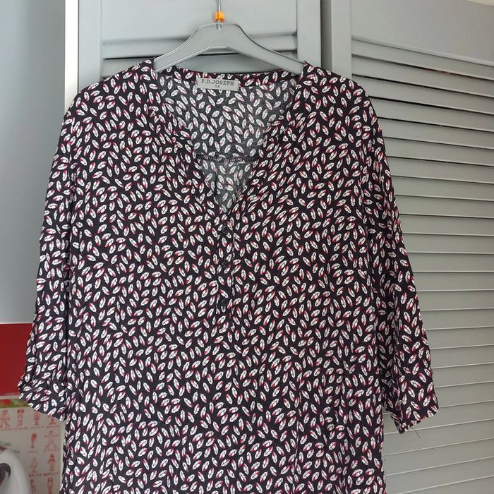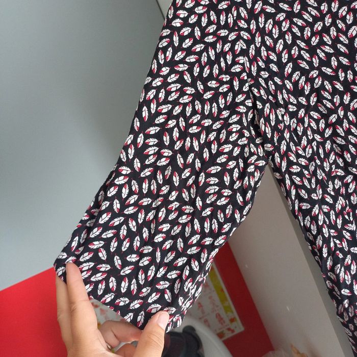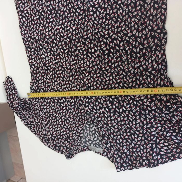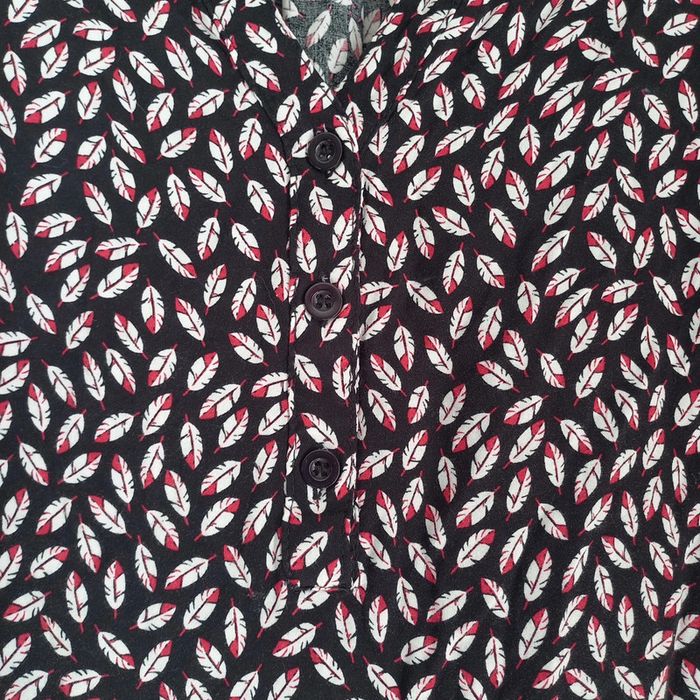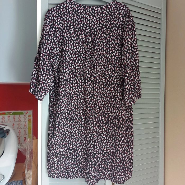 Robe noire avec motifs plumes Col v avec petits boutons Manches demies pouvant etre retroussées Camaieu Taille xl