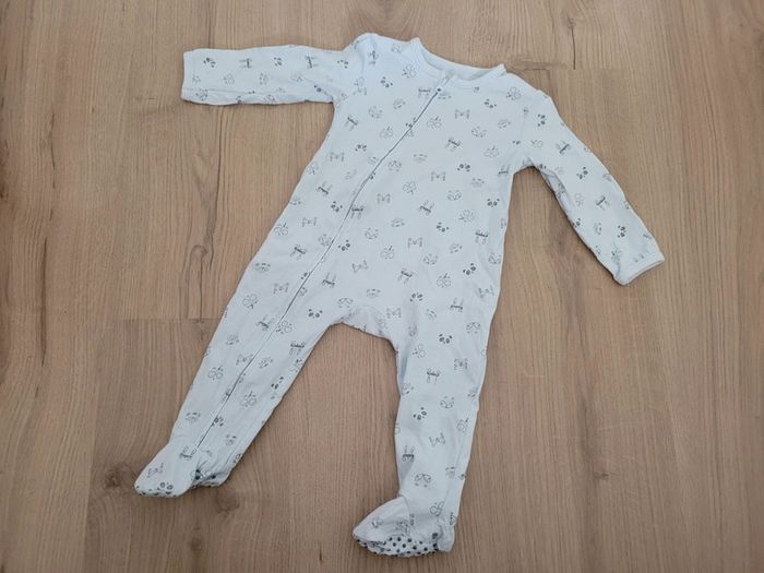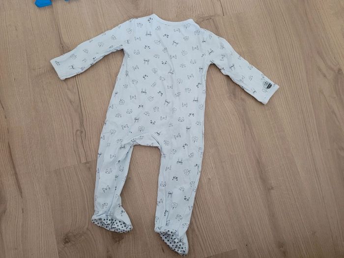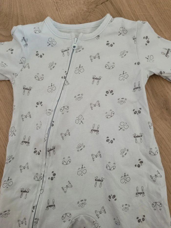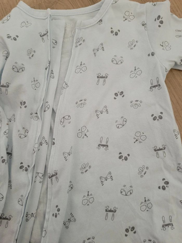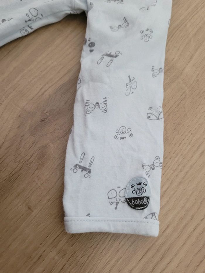 Grenouillère zippée de la marque Boboli. Taille 9 mois petit. Elle est bleu claire avec des motifs d'animaux très mignons.