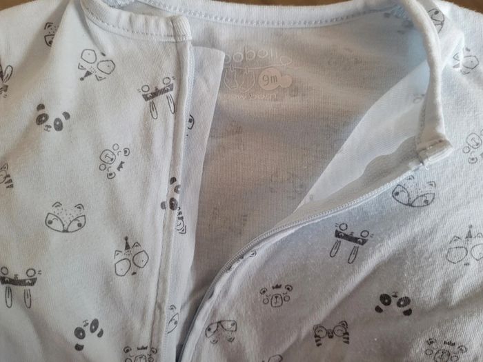 Ouverture par zip sur l'avant avec patte de protection et une bande de tissu pour que la fermeture ne touche pas bébé. (Voir les photos).