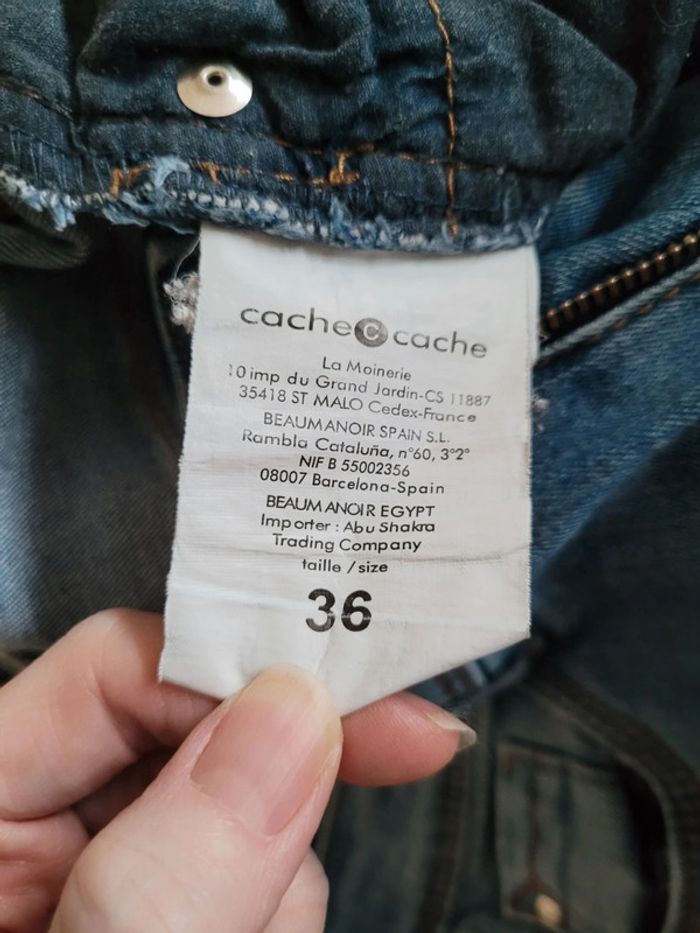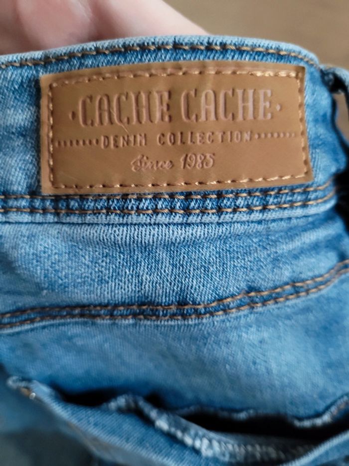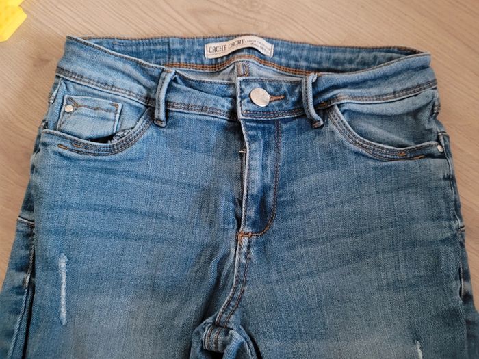 Jean bleu effet déchire sur le devant. Taille 36 marque Cache-cache. Acheté neuf et peu porté. Il est en très bon état. Il taille correctement. Fermeture sur le devant par fermeture éclair et bouton. Passants pour une possible ceinture. Jean stretch. Coton et élasthanne. #femme_baptlily