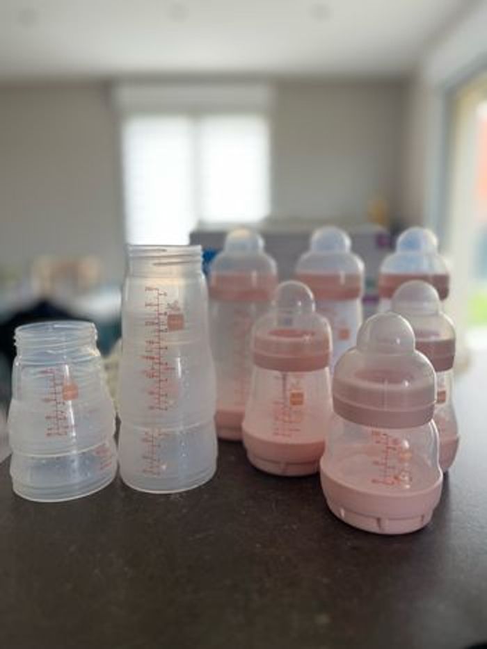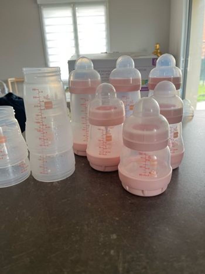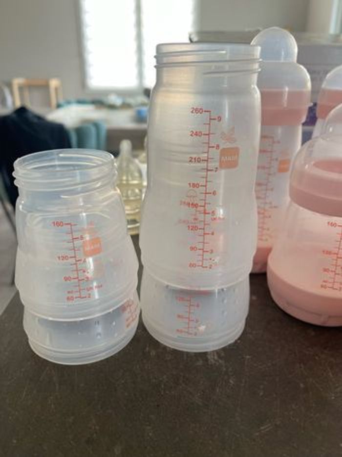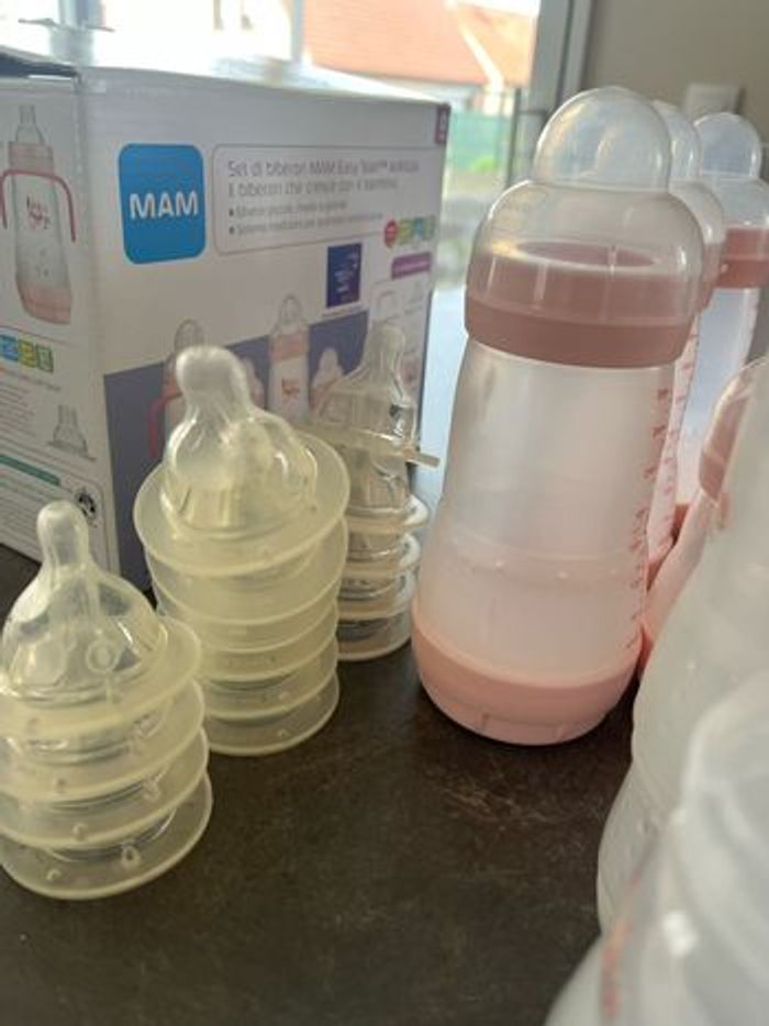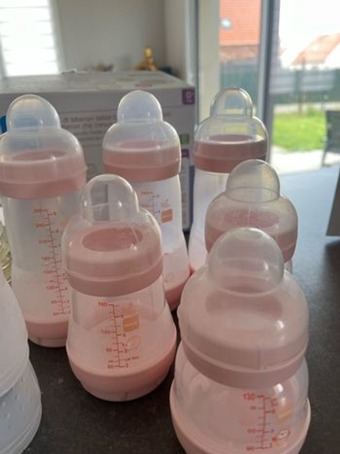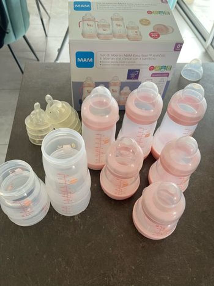 Lot de biberons MAM Il y en a 3 de 260 (+ 2 ) , 2 de 160 (+2) et un de 130. Il y a également les tétines si vous les souhaitez. Il y en a du 0, 1 et 2.