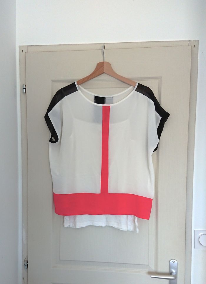 Vends haut, top femme, motifs linéaires noir, corail, blanc, Vendu avec son débardeur blanc en dessous. Marque Miss Captain Taille 40 Très bon état. Peu porté.