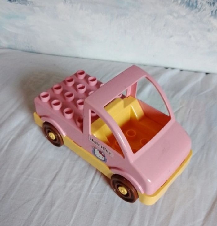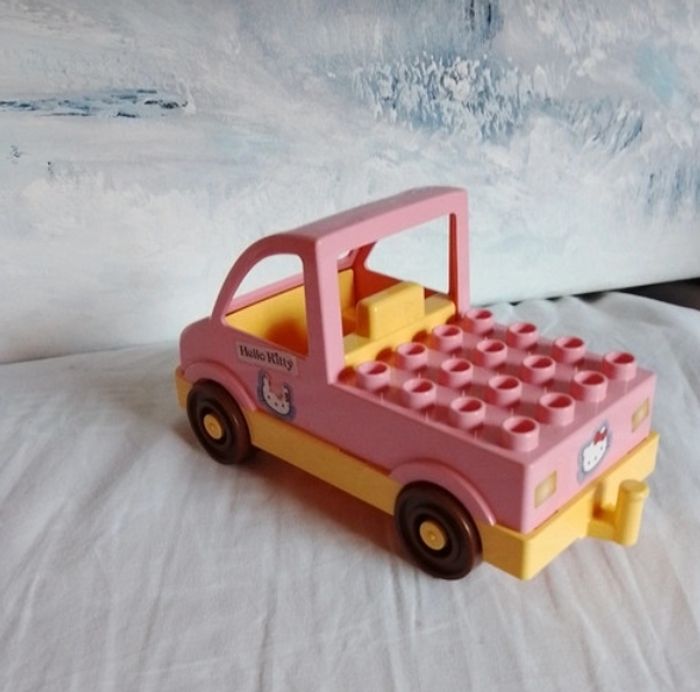 Voiture unico hello Kitty de couleur rose et jaune avec des autocollants collé sur les côtés et a l'arrière de la voiture. En très bon état.