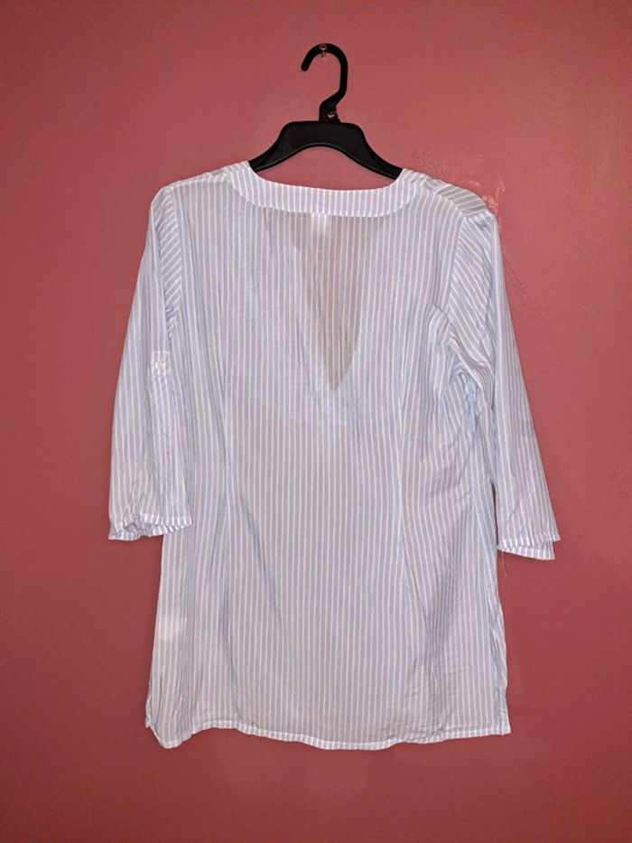 Blouse Camaïeu en très bon état. Avec boutons. Possibilité d'attacher les manches. 54% viscose et 46% coton. Légèrement transparente