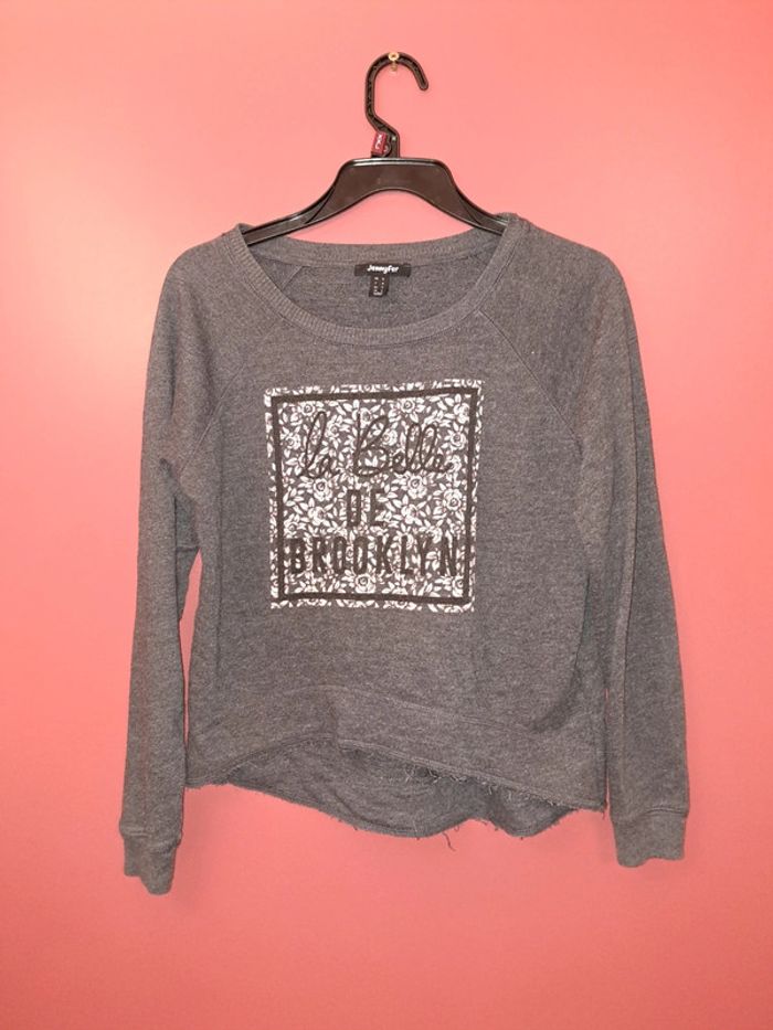 Pull Jennyfer en très bon état. Avec imprimé et effiloché sur le bas. Taille s. 53% coton et 47% polyester