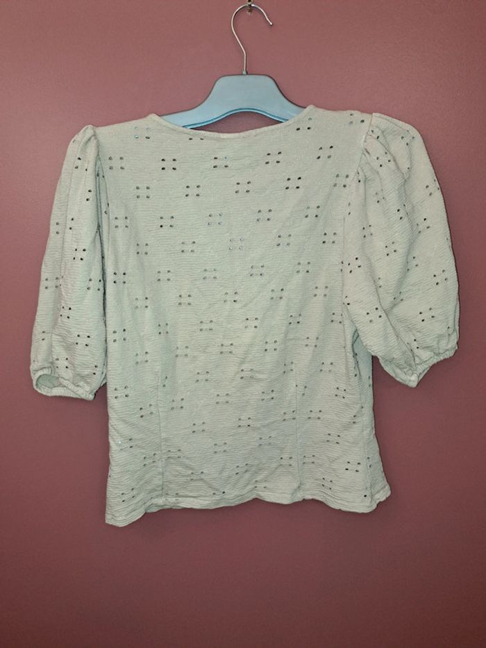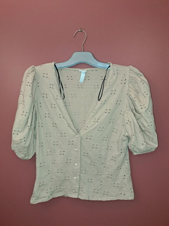 Blouse H&M en très bon état. Volant sur les épaules. Taille m. Avec boutons et boutons de rechange. 98% coton et 2% elasthane #femme38celine14