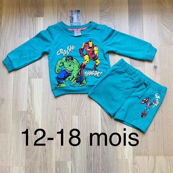 Ensemble 2 pieces - Marvel L’ensemble comprend un pull et son short taille: 12-18 mois marque: Marvel par Primark état: neuf avec étiquette (BB2)