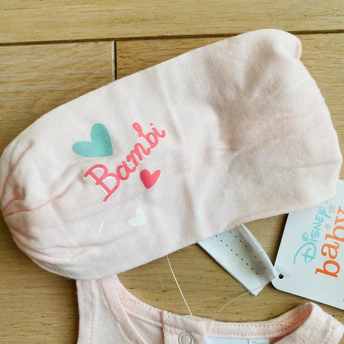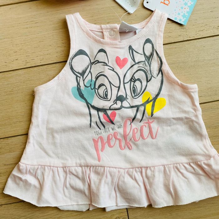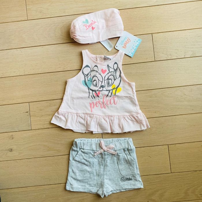 Ensemble Disney 3 pieces comprends un bandeau plus un teeshirt et son short motifs : Bambi marque : Disney taille : 3 mois état : neuf avec étiquette (N2)