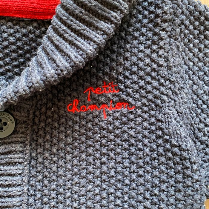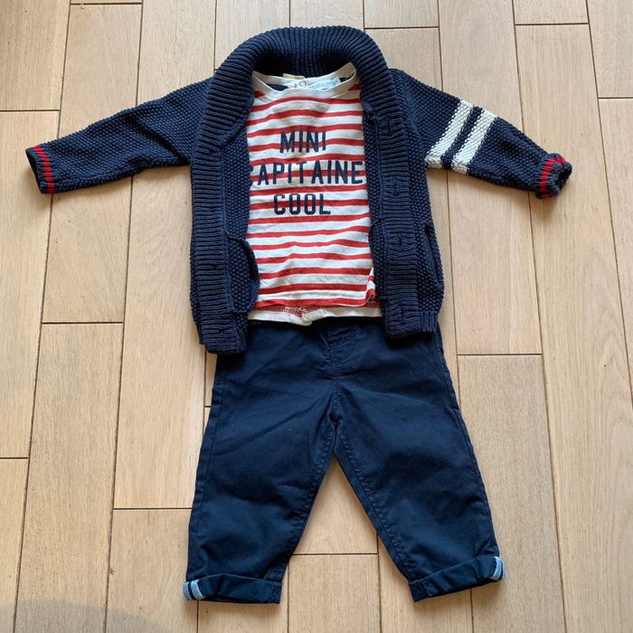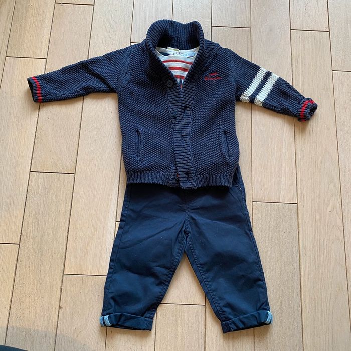 ensemble 3 pièces : gilet + teeshirt manches longues + pantalon style chino taille : 6 mois gilet marque : tape à l’œil teeshirt manches longues : baby gemo pantalon marque : tex état : très bon état déjà porté (R: P3)