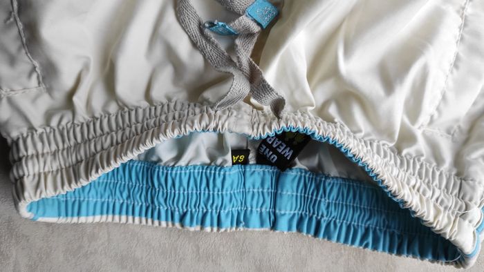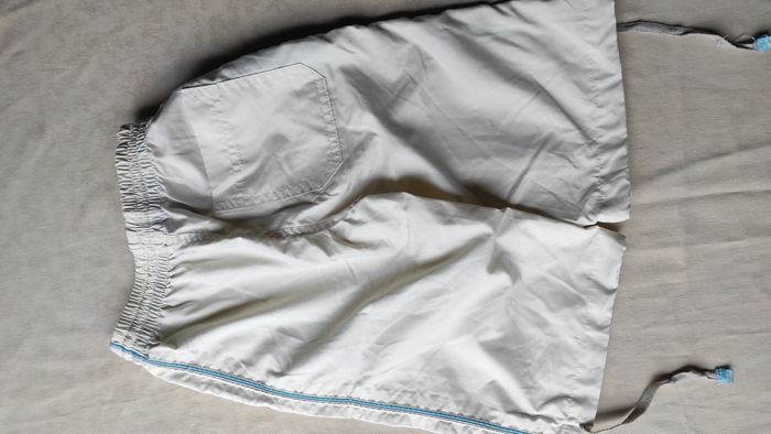 Joli bermuda crème avec motif et bandes turquoises. Taille élastique avec un lien en plus. Un lien sur chaque bas de jambes pour resserrer. Très bon état