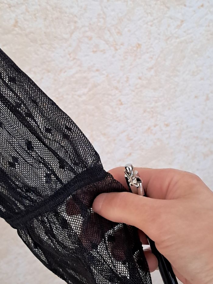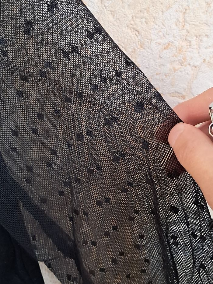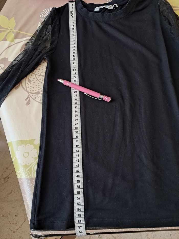 Haut noir avec des manches transparentes et motif. Taille XS Voir photo pour la longueur 57cm