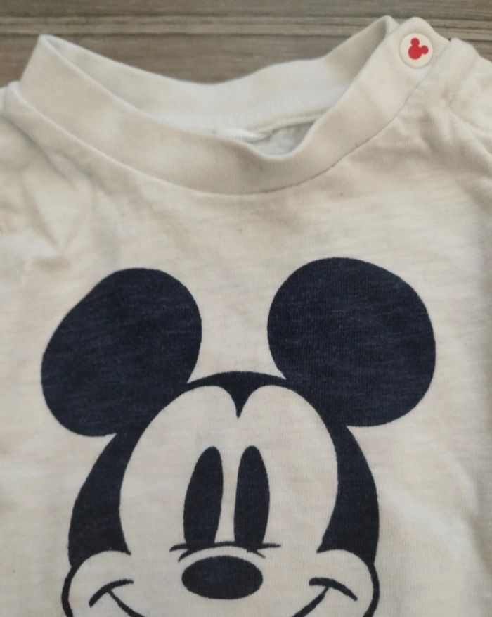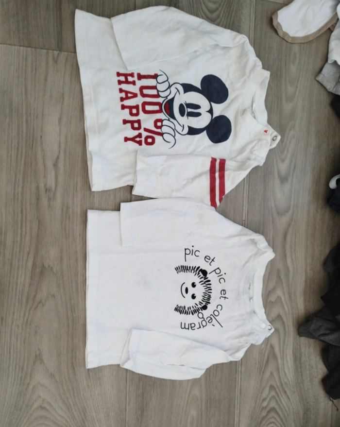 Taille: - Le Mickey 9 mois légèrement tâché au niveau du col. -L’autre 12 mois beaucoup plus tâché sur le devant et sur les bras . Voir photos