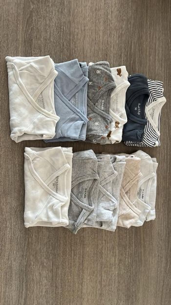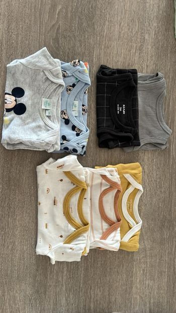 11 bodys manches longues 3 bodys manches courtes 2 bodys Mickey 3 Bodys marcel (manque 1 blanc qui n’est pas sur la photo)