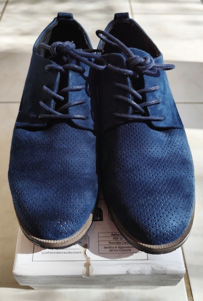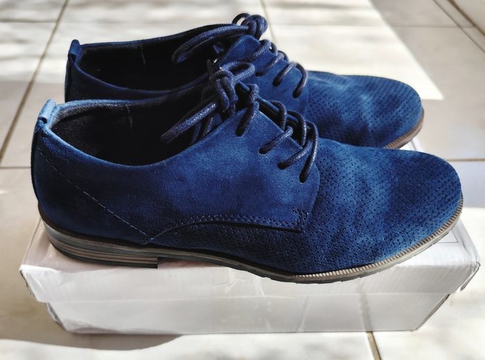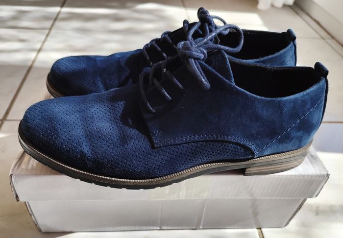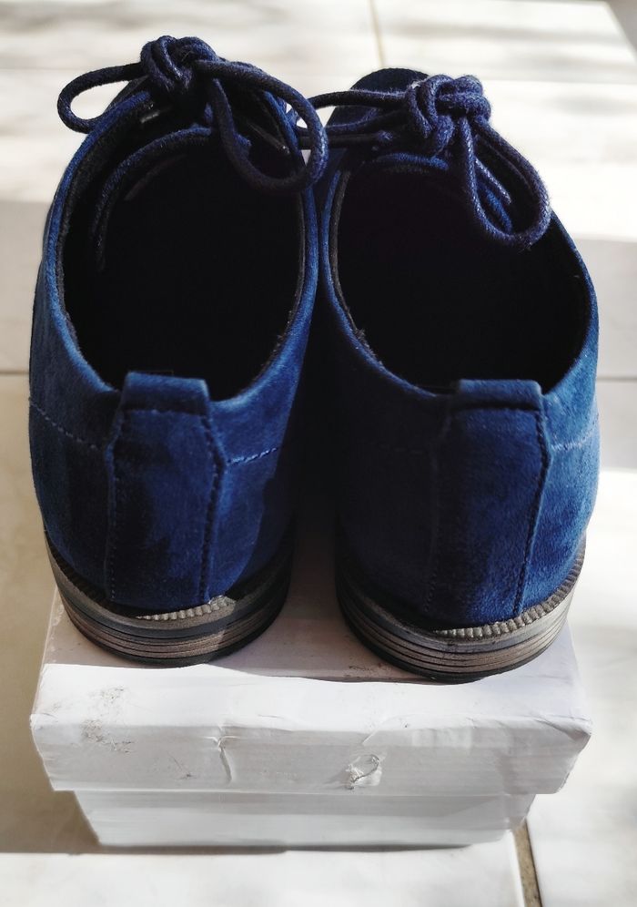 Très belles chaussures à lacets style Derby de taille 37 en Daim. Elles sont vraiment en très bon état, le Daim est vraiment agréable au toucher et donne une petite touche originale. Vendues sans leur boite mais vendues avec une boîte .Pour les petites imperfections il y a juste quelques petites marques dont une sur le talon arrière droite et une petite marque droite vers les lacets toujours sur la chaussure droite.