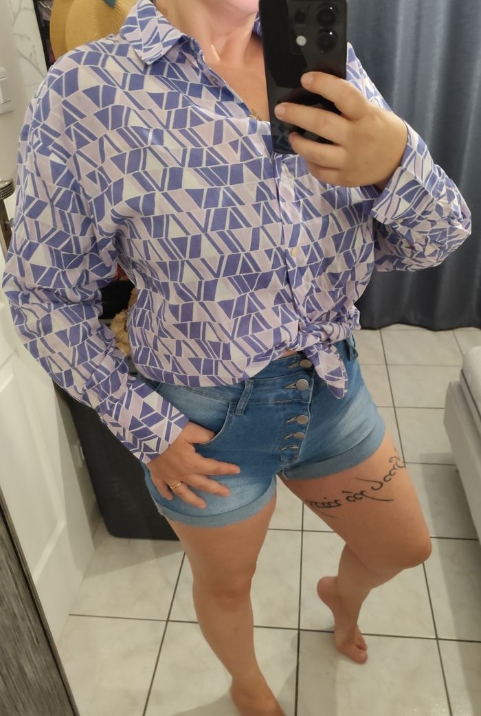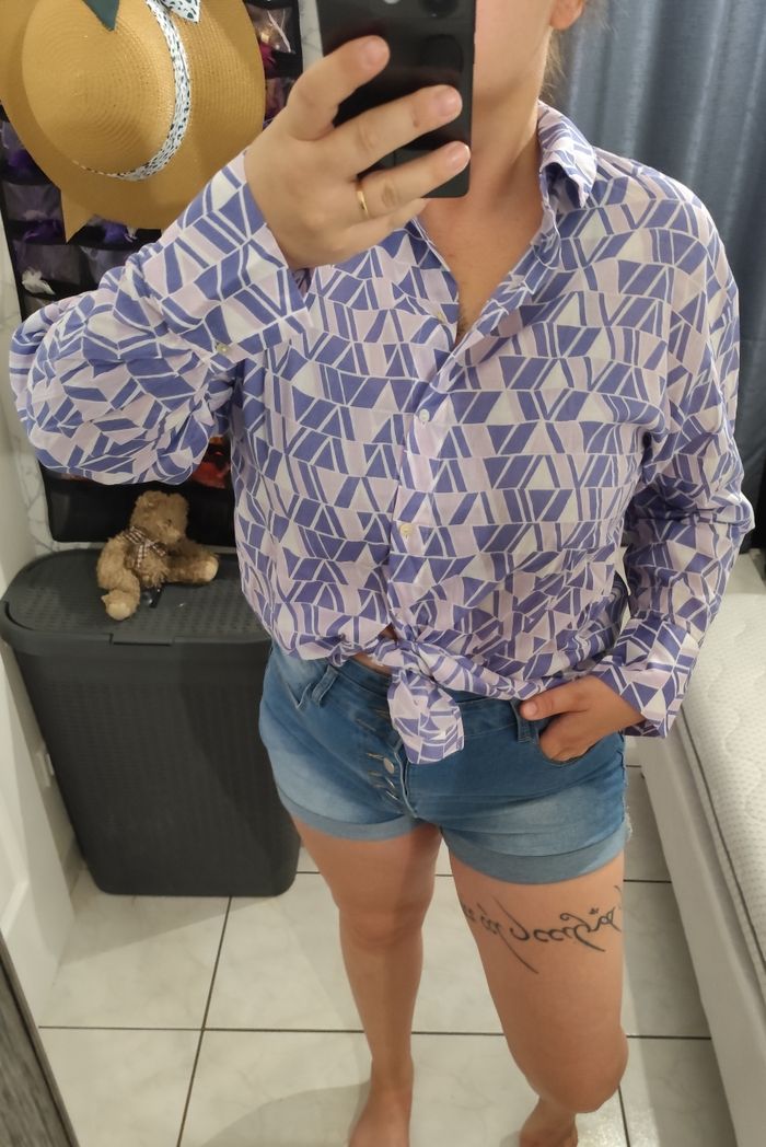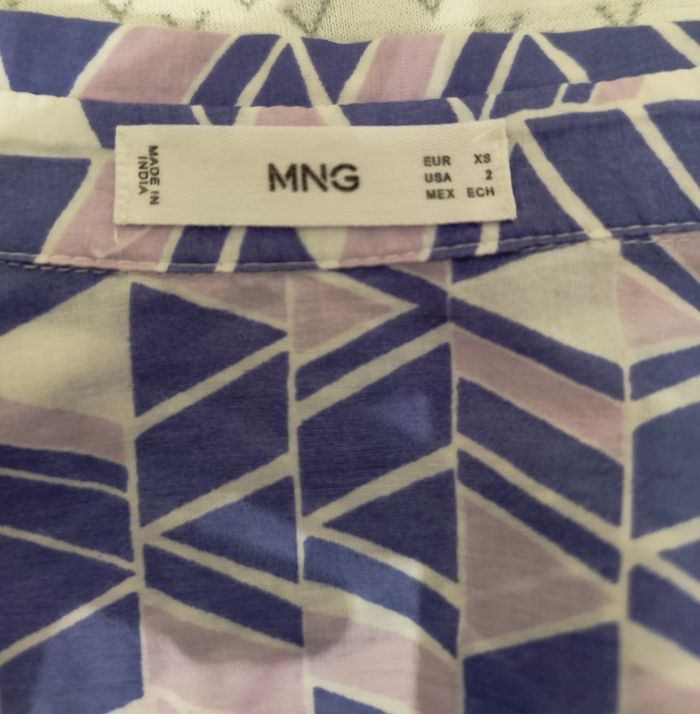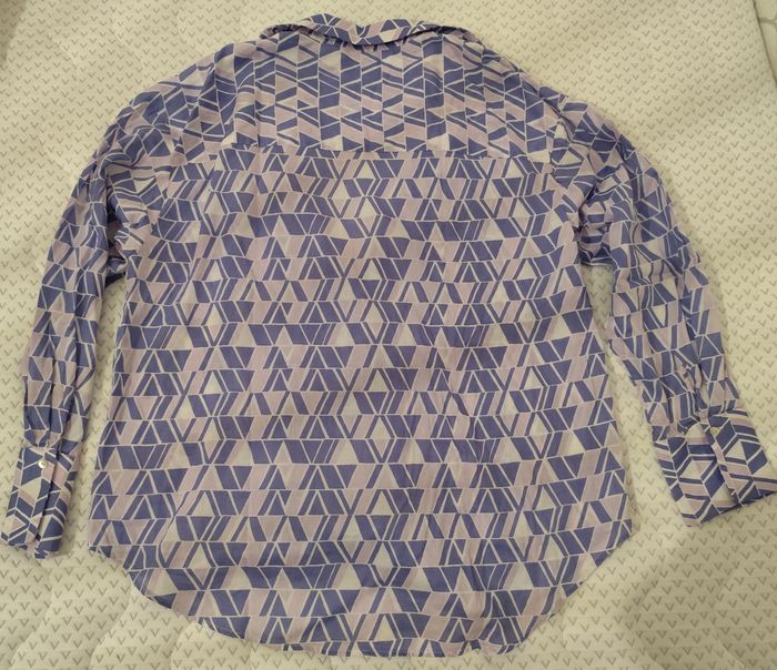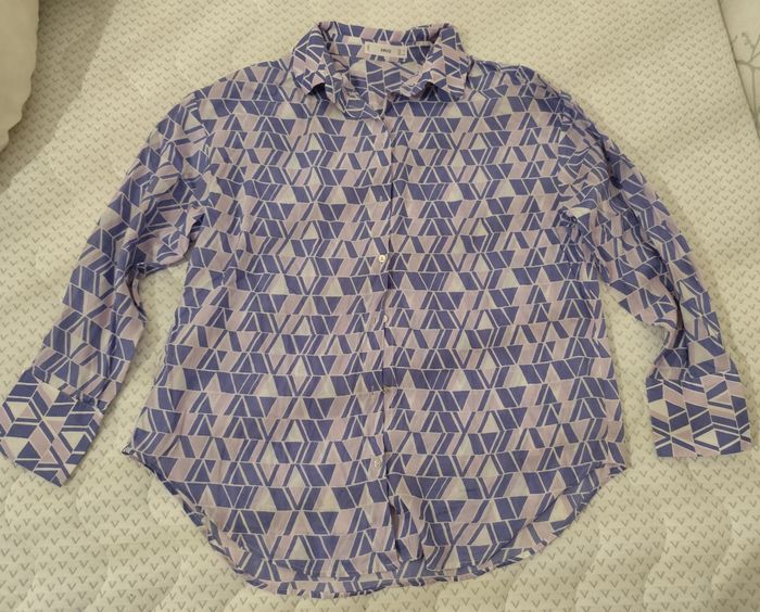 Chemise originale à motifs géométriques violet blanche et mauve en parfait état comme neuve. Taille XS de la marque Mango.