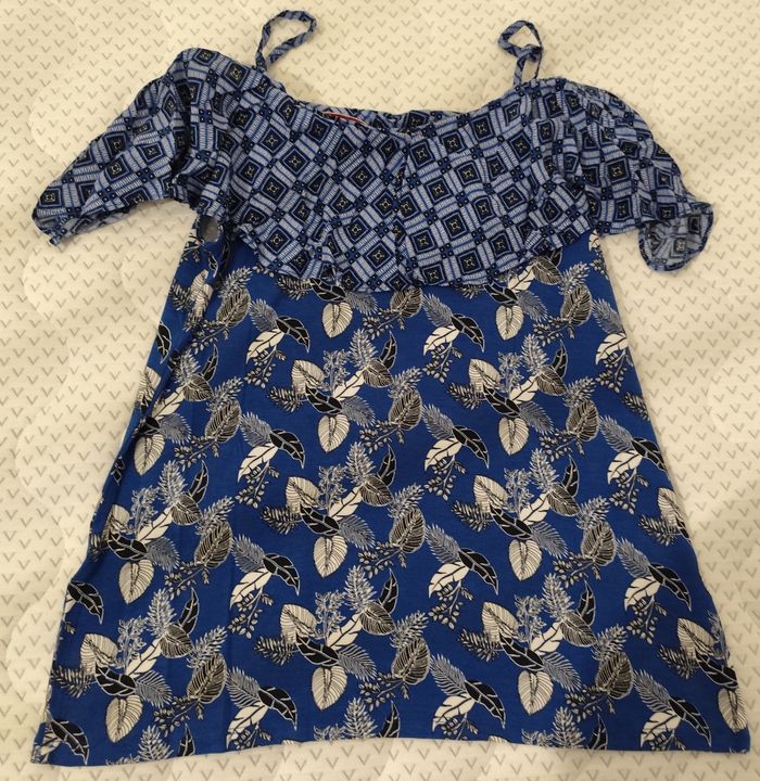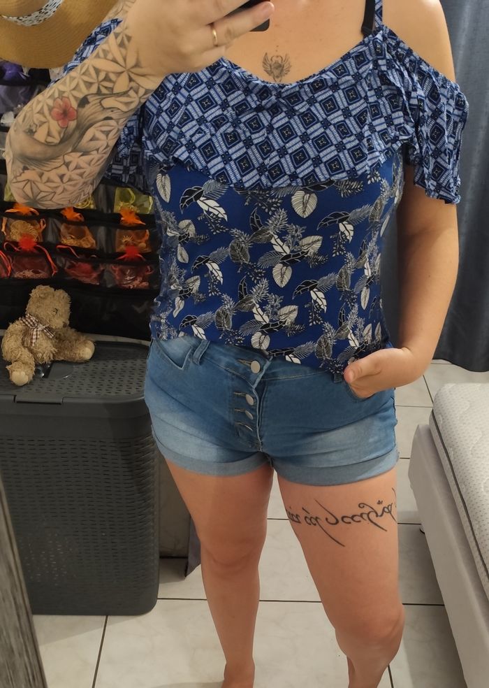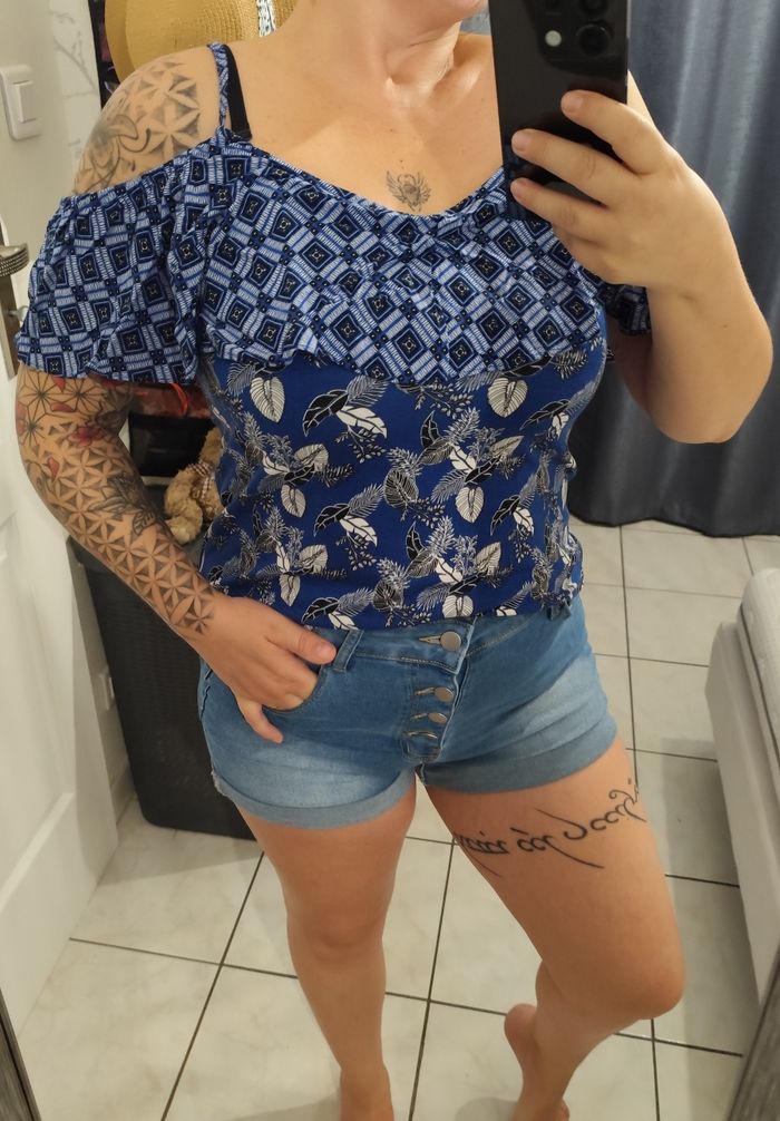 Joli petit haut à épaules dénudées bleu à motifs. Taille 38.Je suis désolée mais les étiquettes ont été coupées à l'intérieur malheureusement j'ai cette fâcheuse habitude car elles sont désagréables.