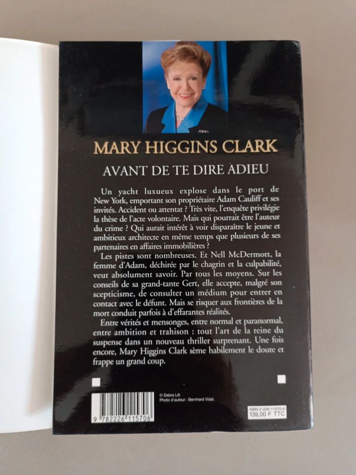 Mary Higgins Clark avant de te dire adieu. Libre grand format. Voici le lien pour voir tous mes livres pour réduire les frais de port et avoir des réductions automatiques par lot de 3 ou 5 : #romain75015_Livres. Envoi rapide et soigné, bien protégé pour le transport.