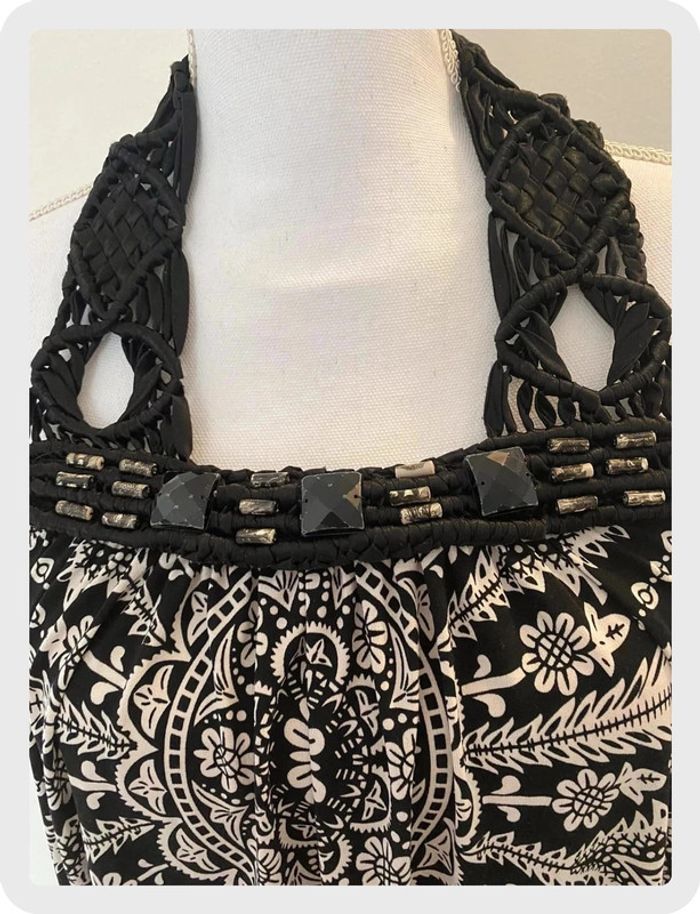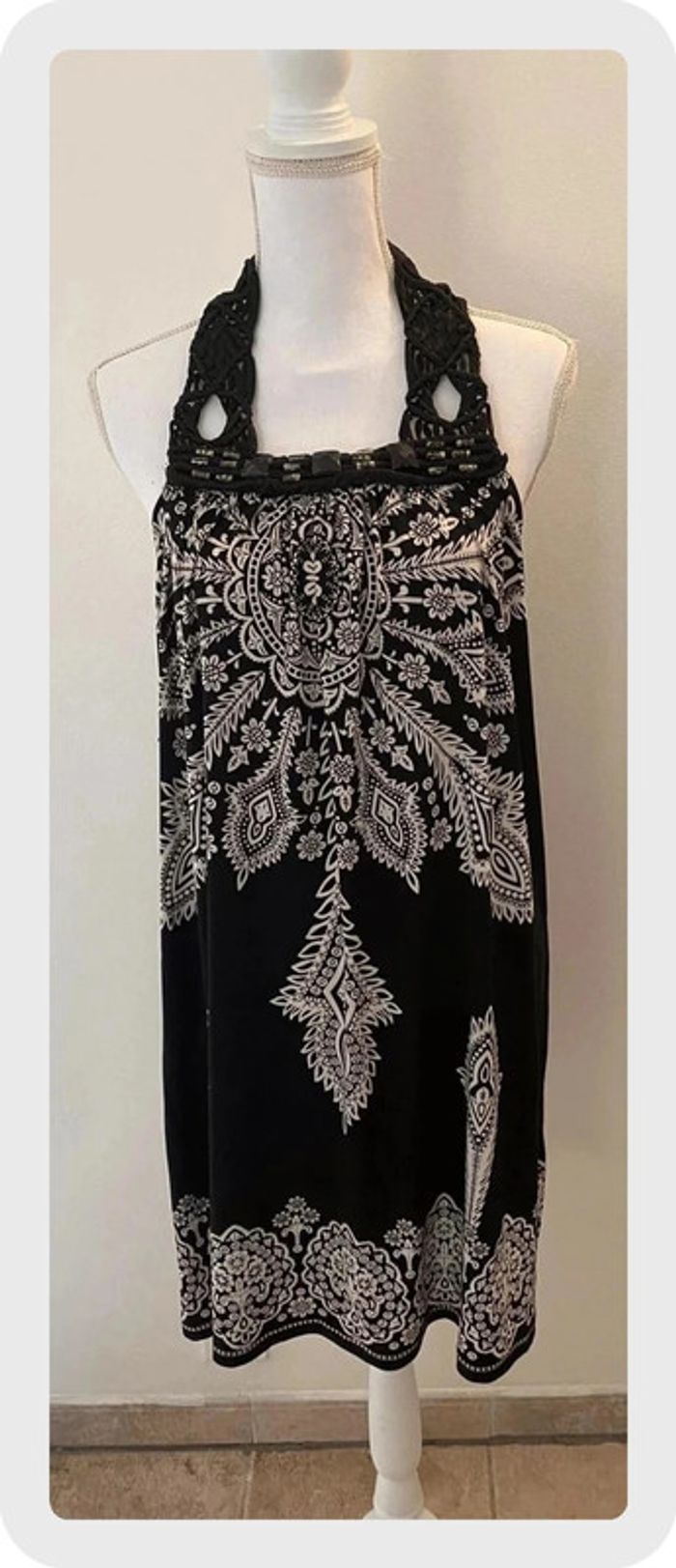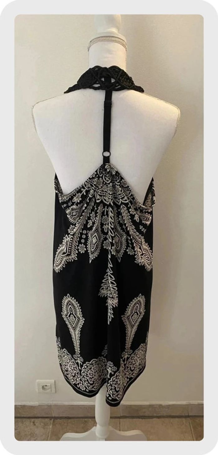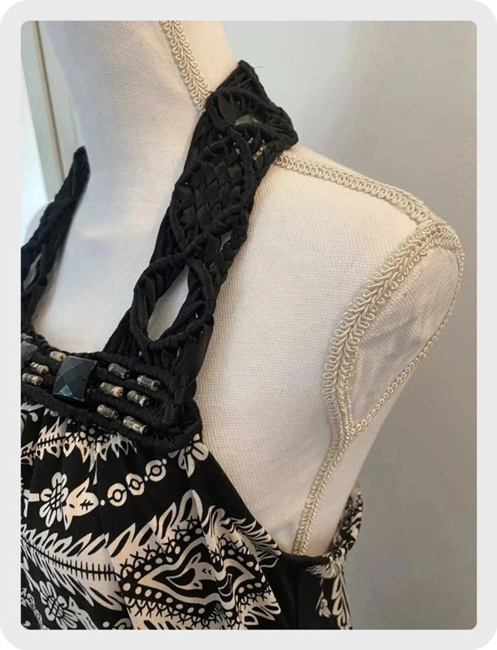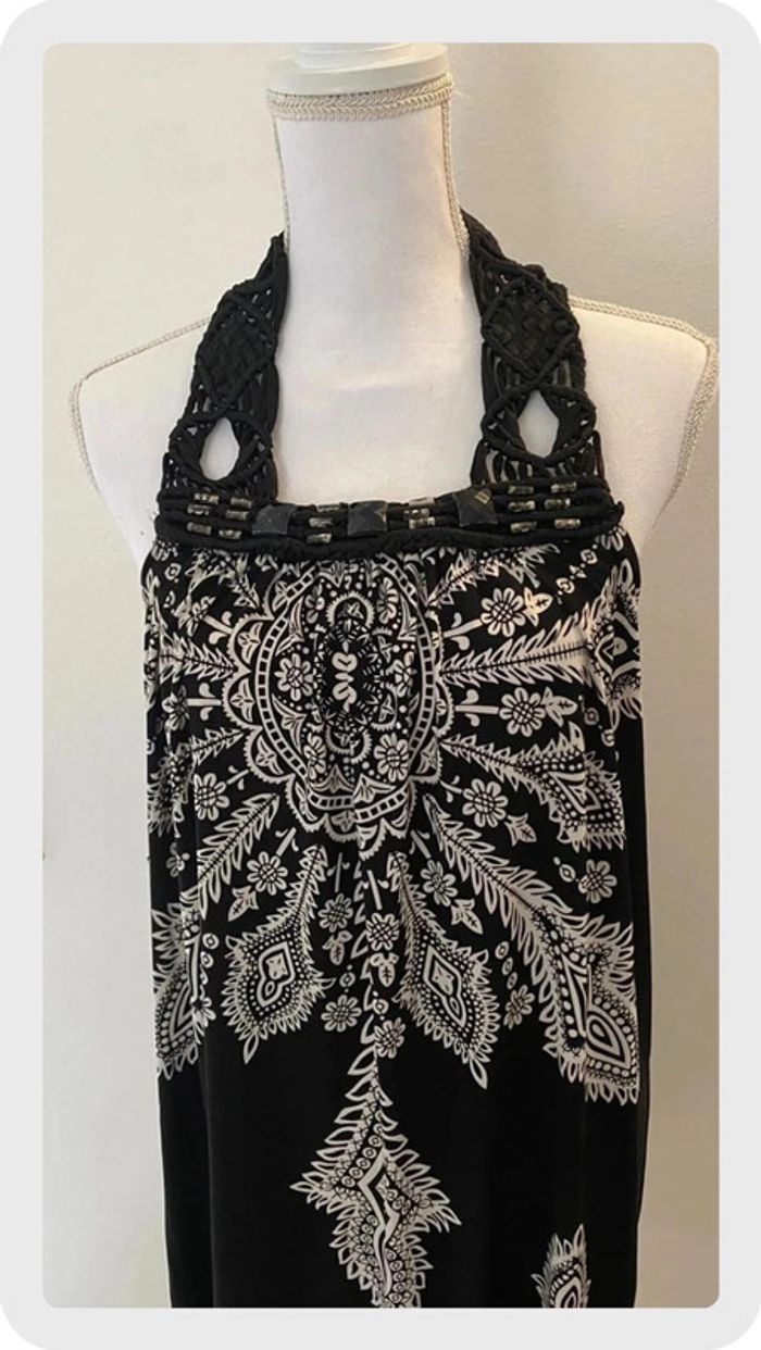 Robe en tissu fluide avec jolis motifs noirs et blancs. Forme dos nu. Cordage sur décolleté avec perles cousues. Taille 36/38. En très bon état qq perles écaillées mais très discret. 🌸Réduction sur les lots activée, n’hésitez pas à visiter mon dressing.