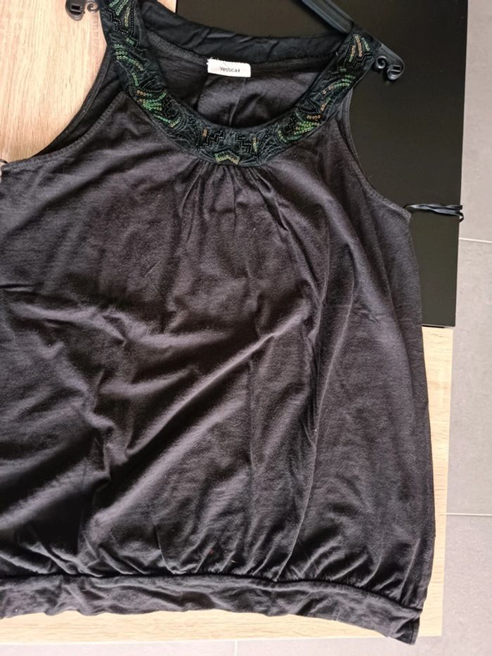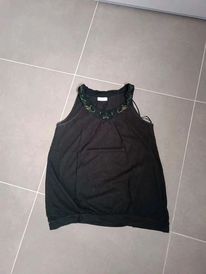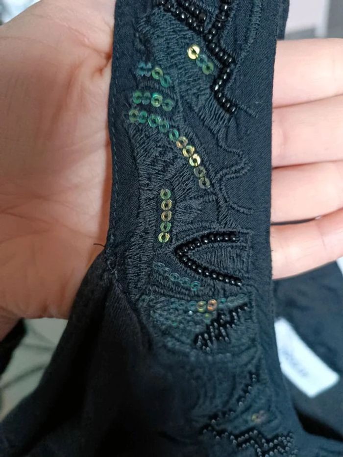 Maillot courte manche Col rond avec perles et paillettes Ne manque pas de perles N'est pas décoloré Ne présente aucun trou Taille L/ 100%coton Hauteur 72cm Largeur 56cm Aisselles à aisselles 52cm