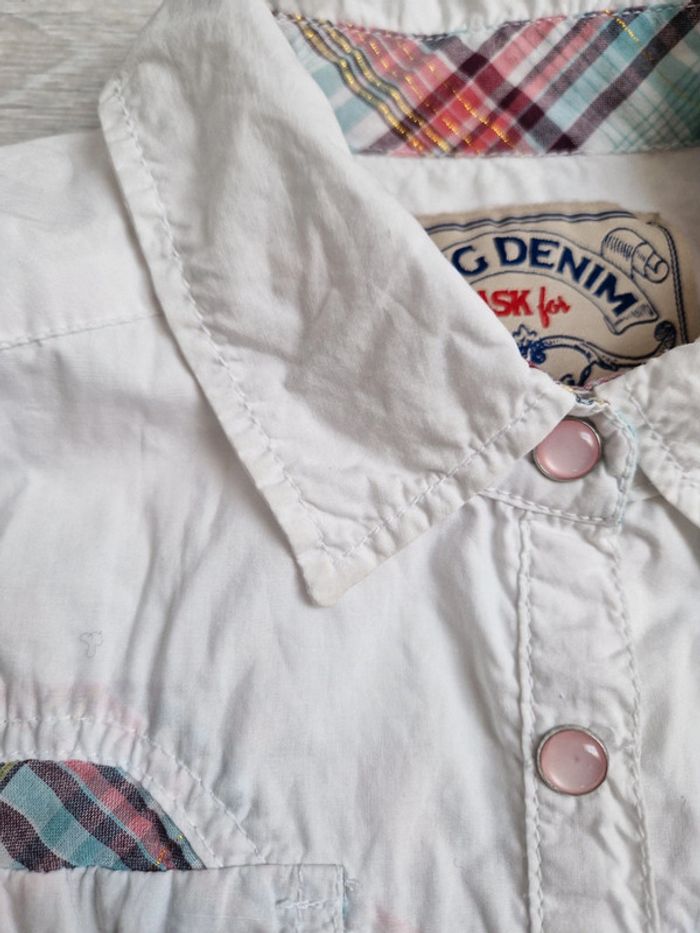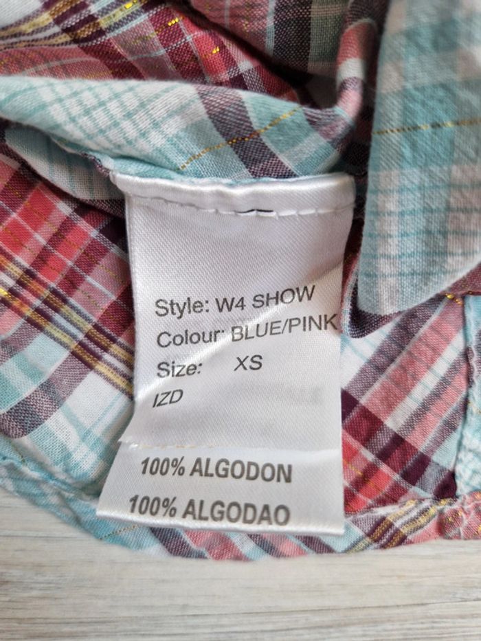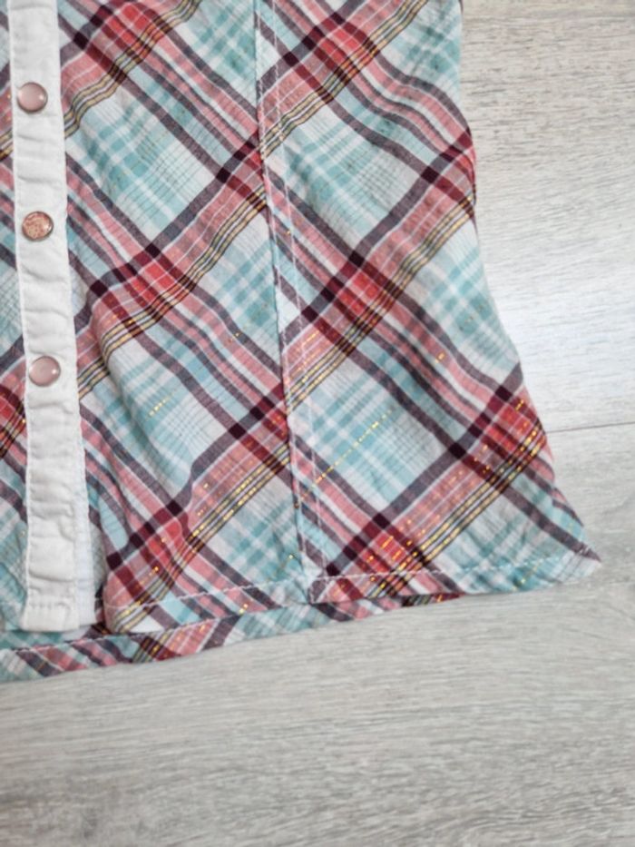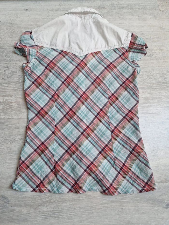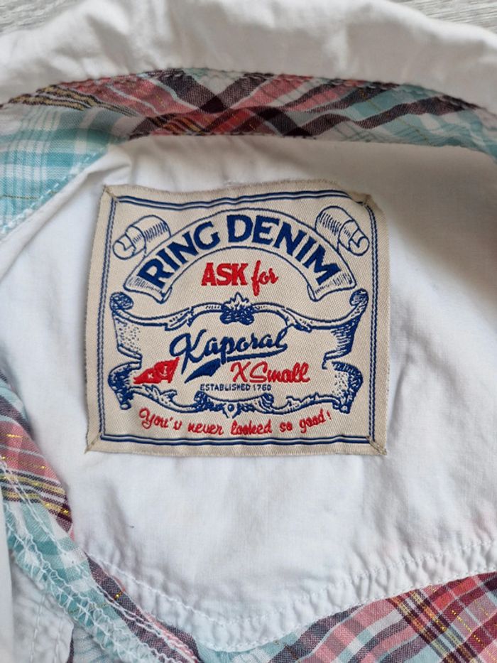 Chemise manches courtes Kaporal XS #julilo7femme Boutons pression Fibres métalliques dorées A signaler : une toute petite tacje au niveau du côté droit de la pointe du col (voir photo) Ele est neuve et n'a jamais été portée : elle a été achetée avec