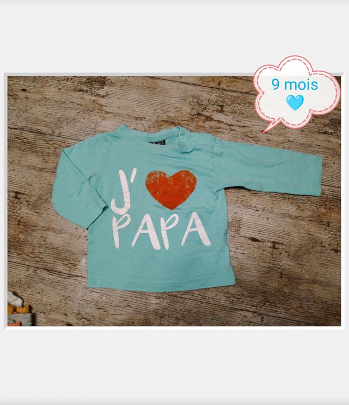 Joli t-shirt manches longues " J'aime Papa " ❤️ Taille 9 mois Très bon état Envoie rapide et soigné D'autres vêtements taille 6, 9, 12 mois à suivre dans mon dressing 🥰 n'hésitez pas à vous abonner pour en être alerté Réductions activées 😊 N'hésitez pas à faire des lot #titenainedu62gars9mois
