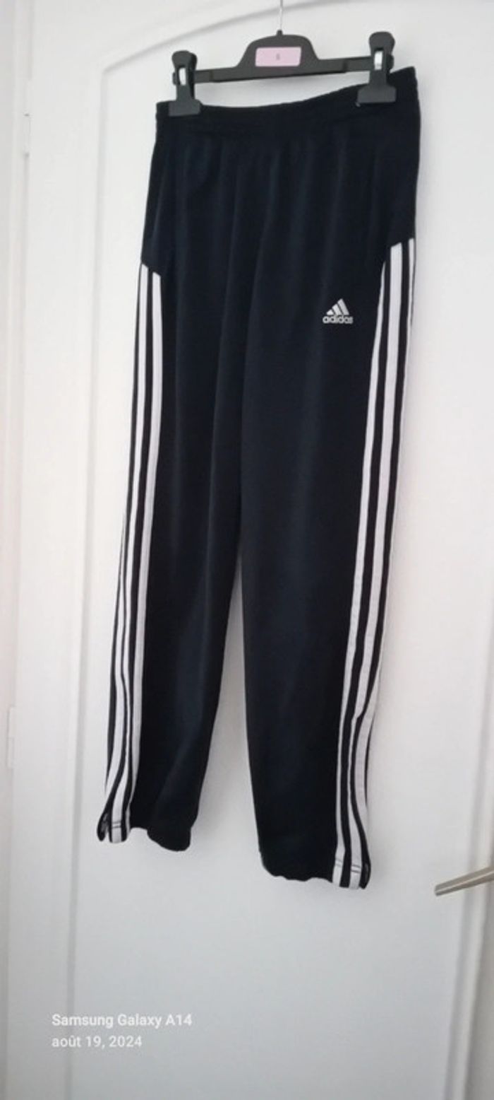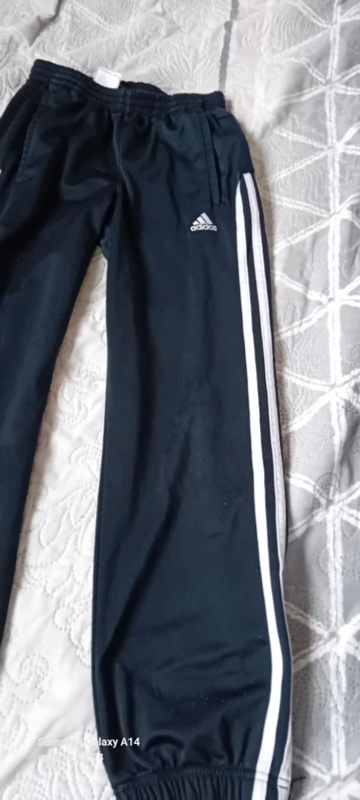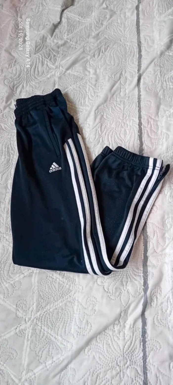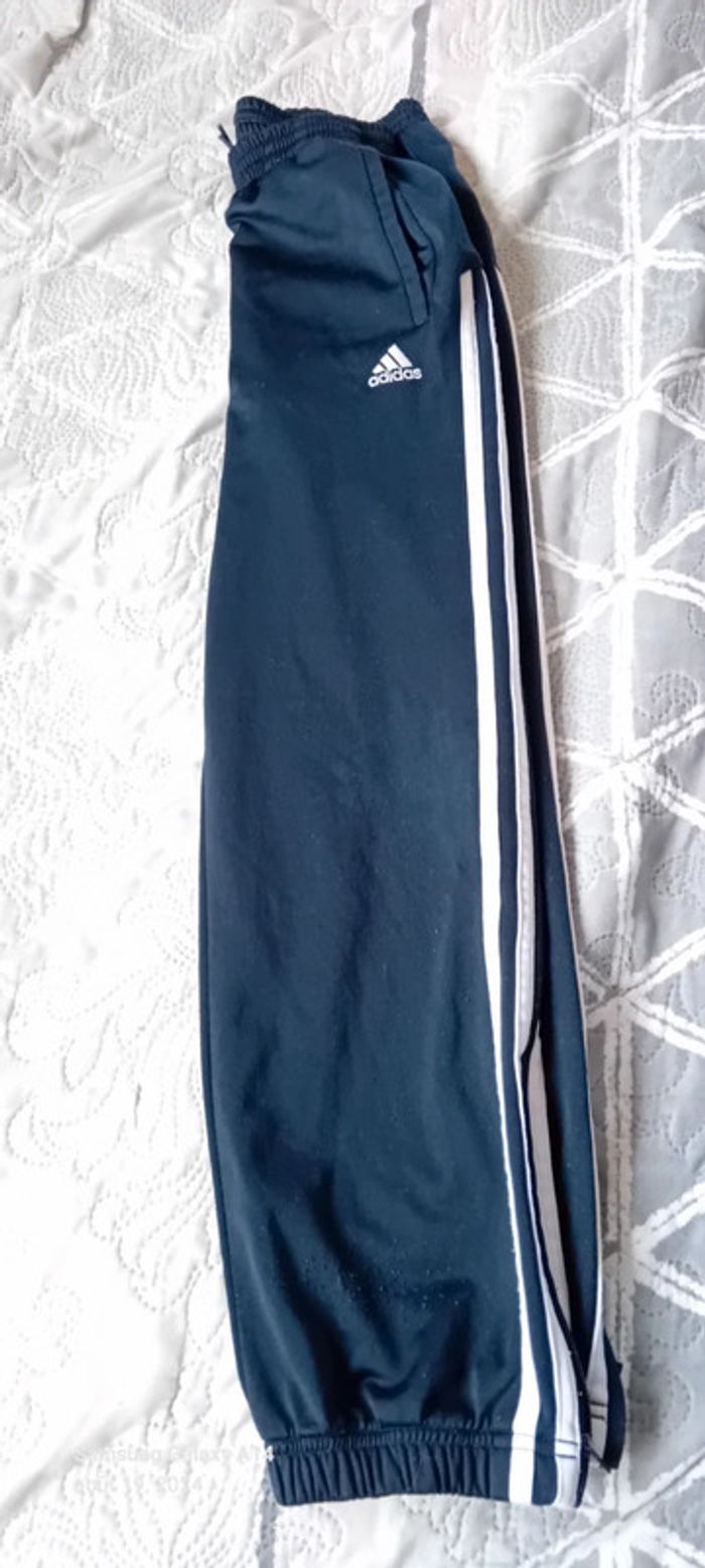 Pantalon de sport en polyester matière fluide et satinée bandes latérales blanches logo Adidas brodé sur le devant fermeture éclair en bas des jambes poches devant taille elastique avec lien à resserer regular droite longueur 85 cm largeur cuisses 23 cm largeur bas de jambe 15 cm porté plusieurs fois en bon état ⚠️ quelques traces d usure et bouloches (voir dernières photos) #midole #midolegarçon #midolesport #midolegarçon10ans #pantalondesport #pantalondesport10ans #adidas #pantalonadidas #garçon10ans #vetementdesport