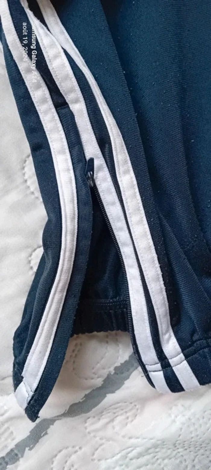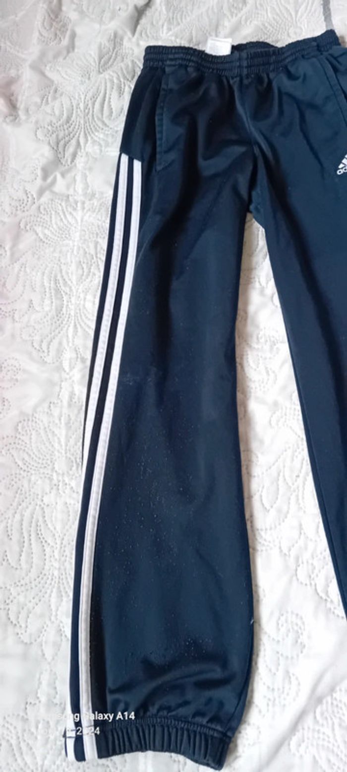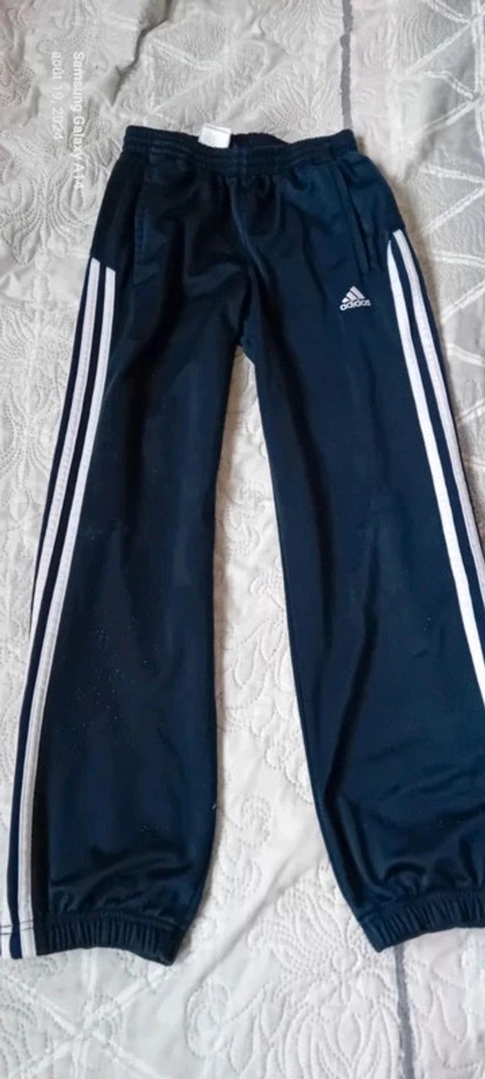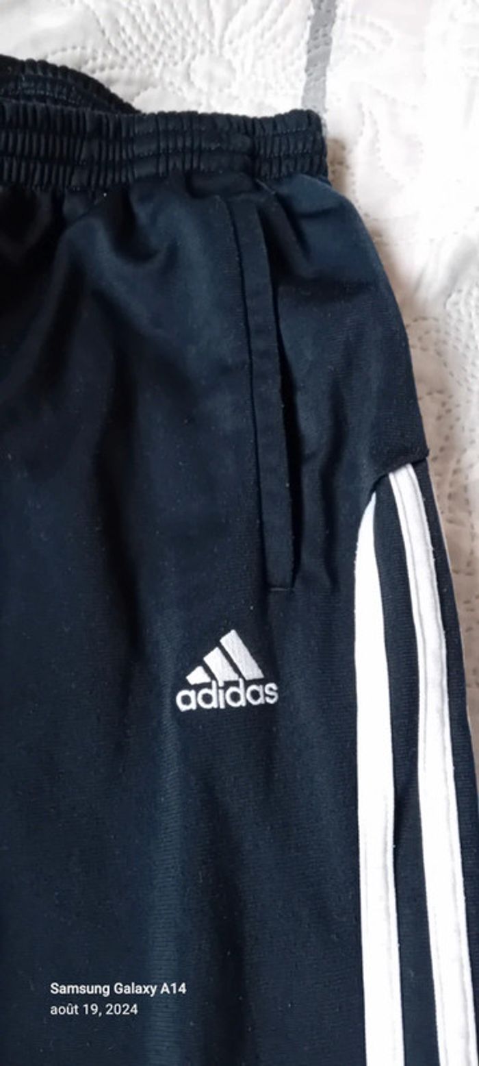 Pantalon de sport en polyester matière fluide et satinée bandes latérales blanches logo Adidas brodé sur le devant fermeture éclair en bas des jambes poches devant taille elastique avec lien à resserer regular droite longueur 85 cm largeur cuisses 23 cm largeur bas de jambe 15 cm porté plusieurs fois en bon état ⚠️ quelques traces d usure et bouloches (voir dernières photos) #midole #midolegarçon #midolesport #midolegarçon10ans #pantalondesport #pantalondesport10ans #adidas #pantalonadidas #garçon10ans #vetementdesport