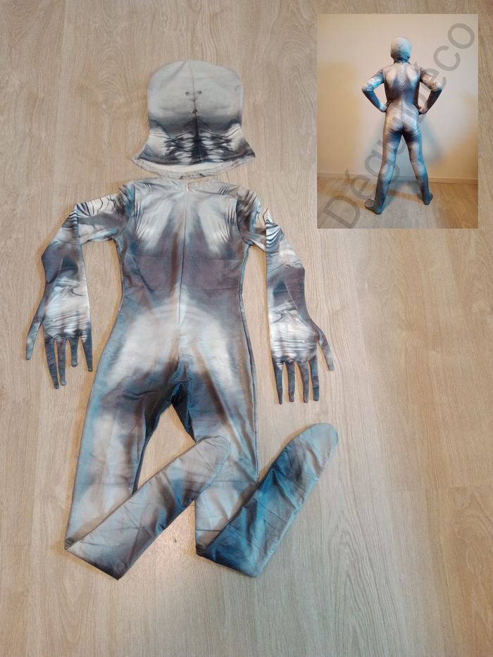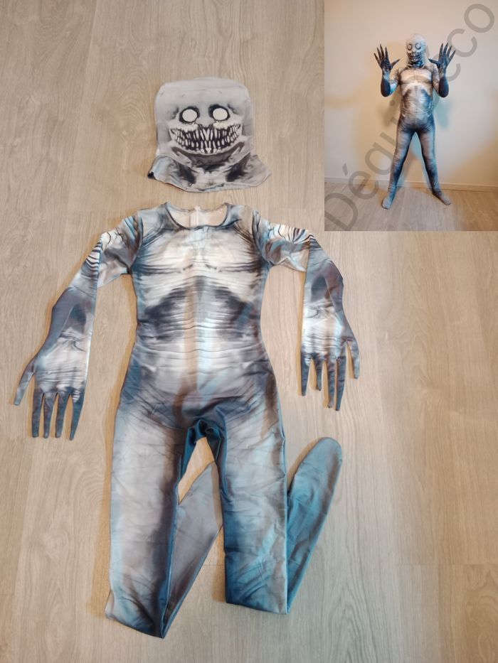 Costume fantôme, seconde peau, avec mains effet griffes. Taille 110 (5 ans) Combinaison complète avec gants et pieds intégrés + cagoule. Fermeture dans le dos. Matière polyester et spandex. Lavage en machine à 30 °. Pas de sèche linge, pas de repassage Même qualité que les déguisements Spiderman dans mon dressing Carnaval, Halloween, monstre, mort vivant