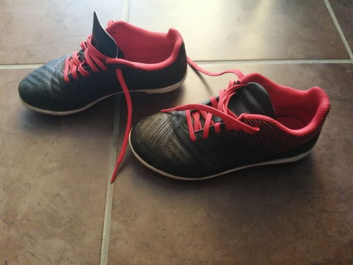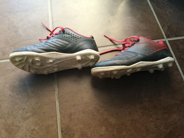 Chaussures de foot noir et rouge, à lacets, crampons, pointure 31. De marque Kipsta de chez Décathlon.