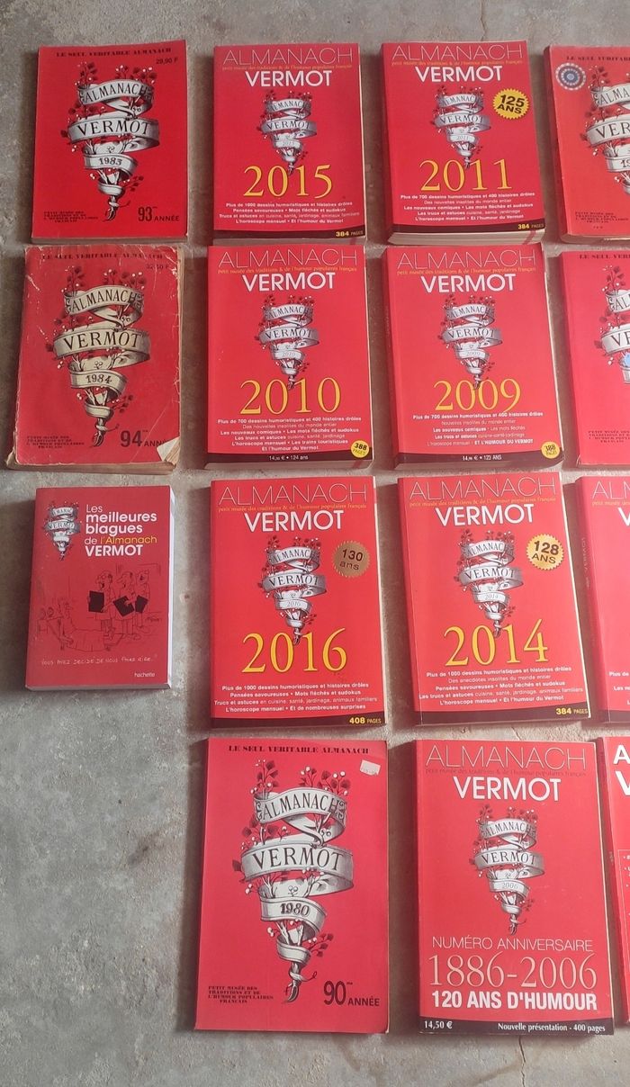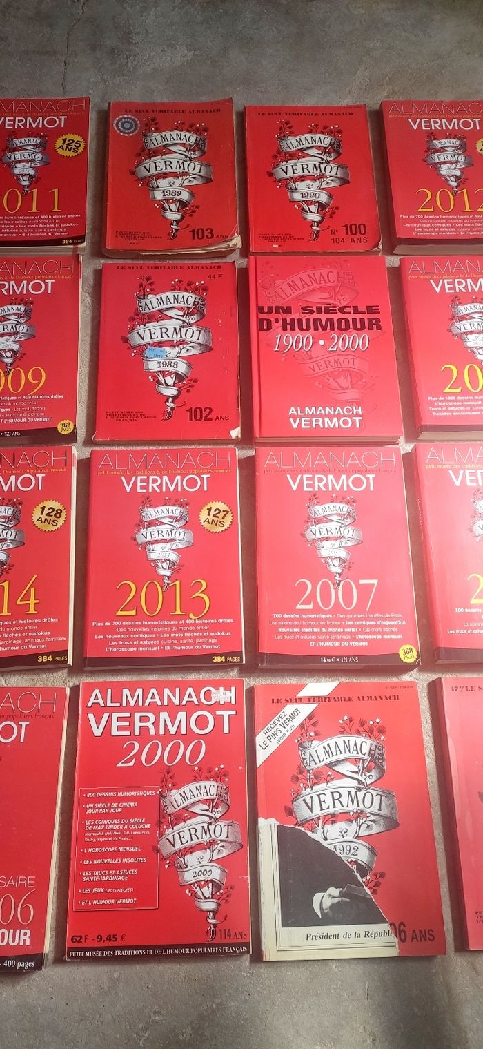 Lot de plusieurs almanach: 1977, 1979, 1980, 1983, 1984, 1988, 1989, 1990, 1992, 2000, 2001, 2007, 2008, 2009, 2010, 2011, 2012, 2013, 2014, 2015, 2016, 2017. + Éditions : - Un siècle d'humour 1900 à 2000 - Les meilleurs blagues de l'almanach vermot - l'almanach des grosses têtes RTL 2013 - N°anniversaire 1886-2006 - l'almanach des grosses têtes 2016