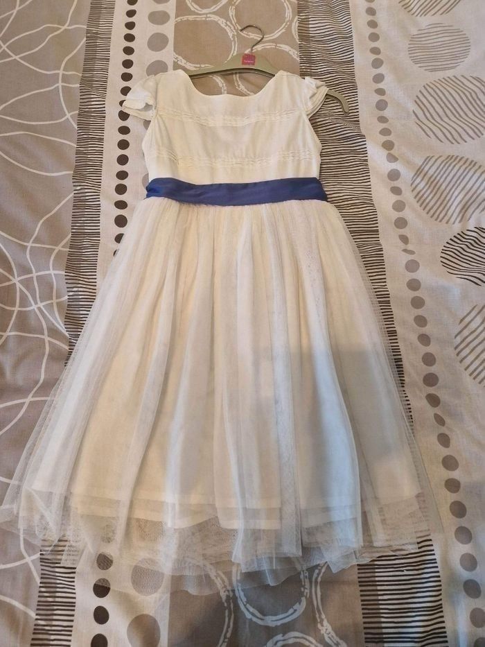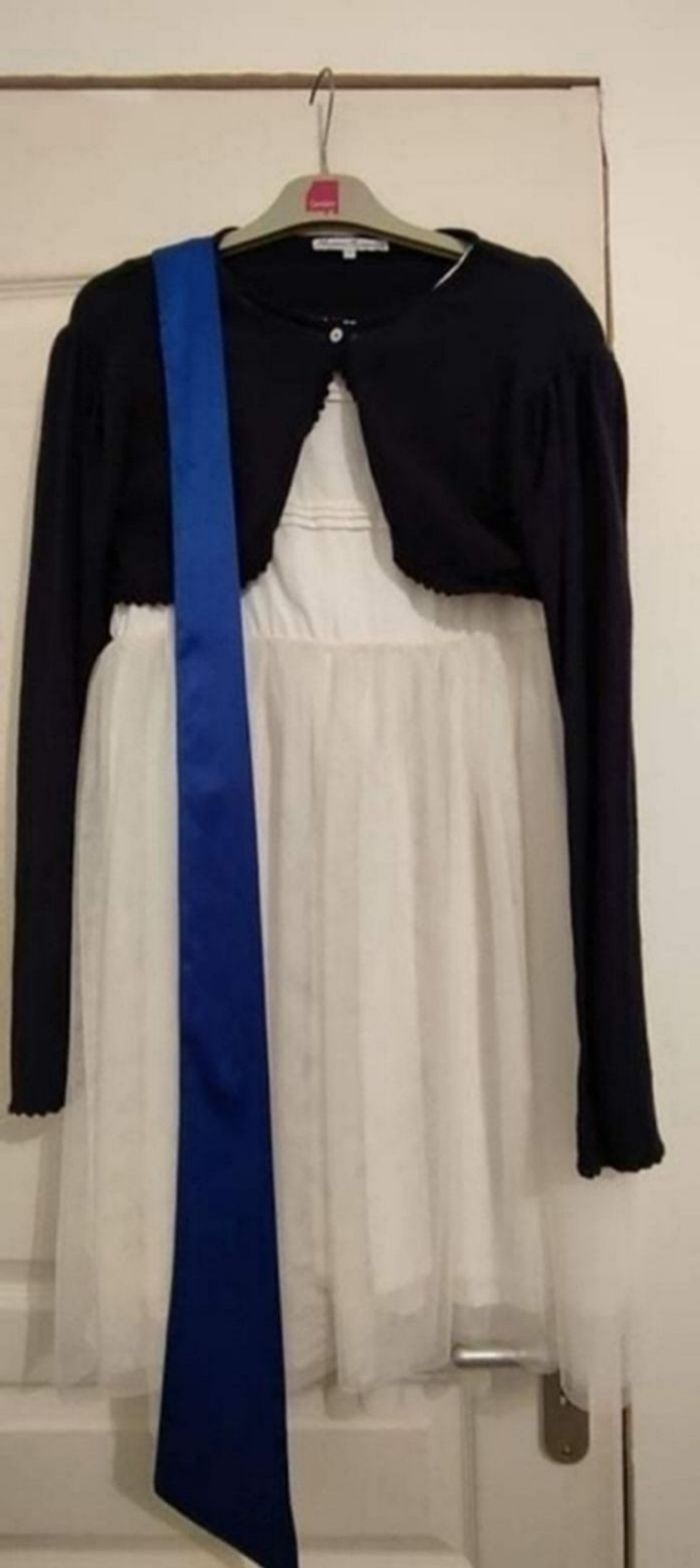 Robe de cérémonie "les petits inclassables " composée de plis religieux qui se prolongent sur des petites manches élégantes. Robe ornée d un dos délicat en forme de coeur , réalisée en satin de coton , en tulle forme tutu avec sa jupe aux 2 épaisseurs de tulle et .aussi entièrement doublée d un voile de coton. elle se porte avec une ceinture bleu roi en satin de coton pour faire un joli noeud au dos . Mais peut se porter sans ceinture Longueur au dessus des genoux. Comme neuve portée 1 seule fois pour un mariage, pendant 5 heures ET boléro fille " les petits inclassables " Boléro fille bleu nuit 14 ans les petits inclassables Comme NEUF porté 1 seule fois pendant 5 heures pendant un mariage la robe et le boléro sont nettoyés négociable de façon raisonnable le lot peut se vendre séparément, me contacter