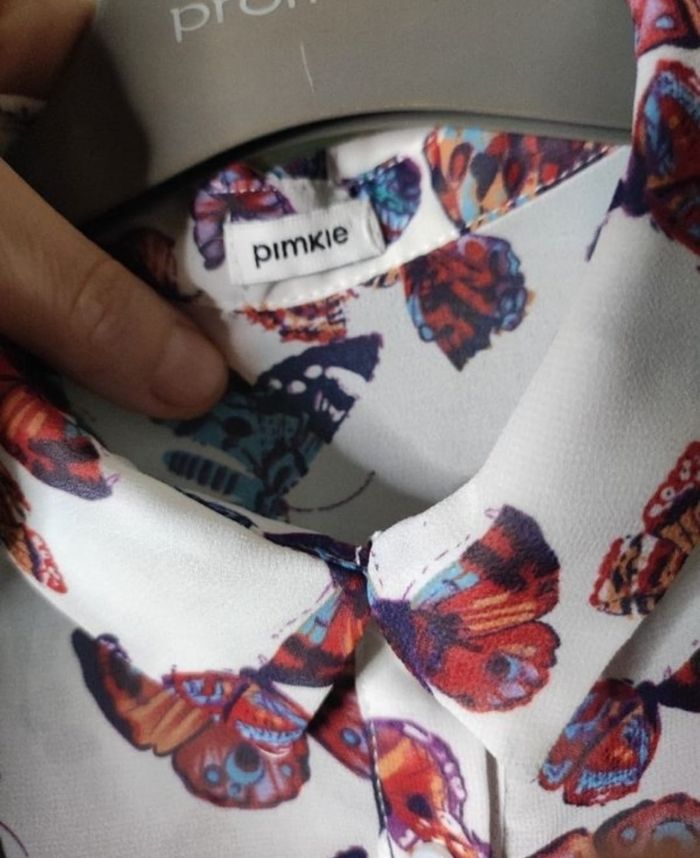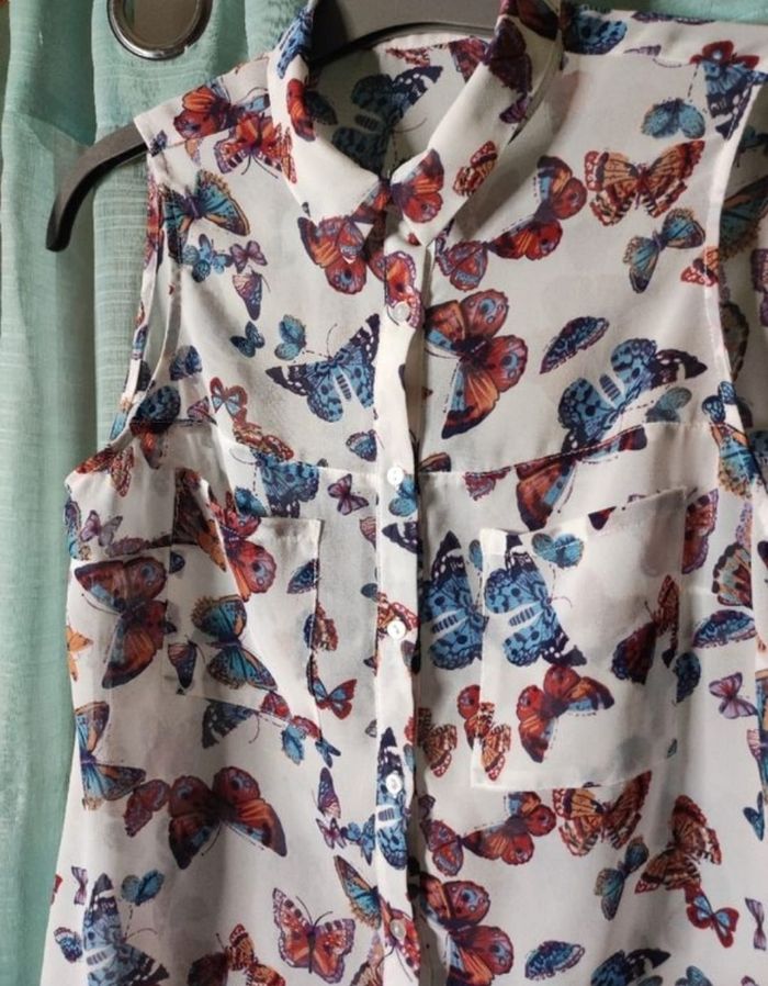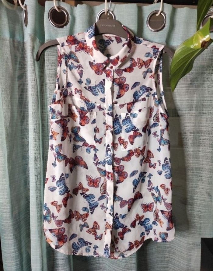 Jolie chemisier sans manches a motifs papillon avec deux poches et légèrement transparent, fluide et léger de chez pimkie en taille 36. En parfaite état
