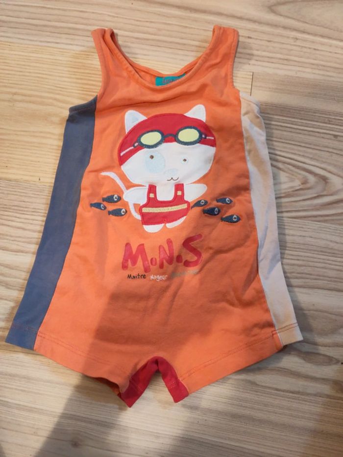 Combinaison été sans manches, façon marcel. Motifs poisson et plage. Notée 3 ans mais correspond à du 2 ans.