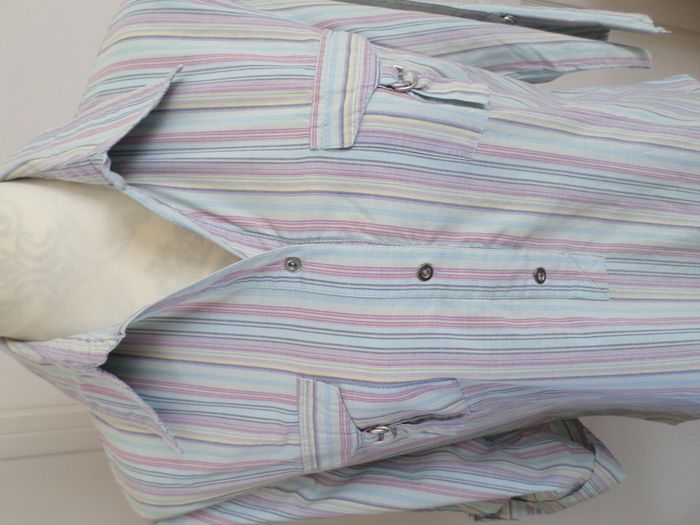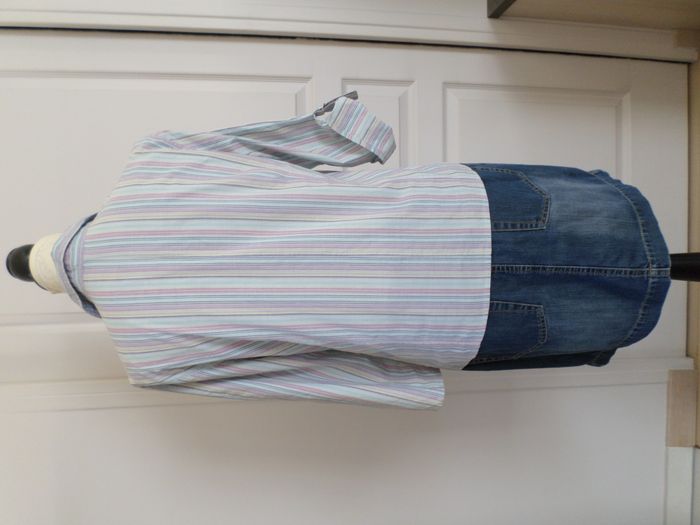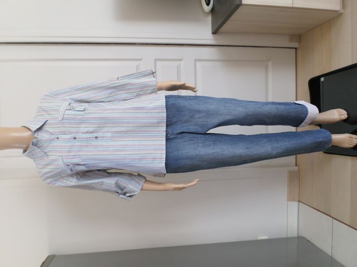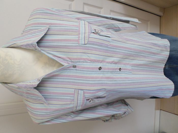 Très jolie blouse à rayures verticales aux couleurs pastel d’été 🌞 (bleu, parme, rose…) avec 3 boutons à l’avant 2 poches à la poitrine Manches retroussables par patte Marque : Camaïeu Très bon état Epaule à épaule : 44 cm Aisselle à aisselle : 50 cm Longueur de manche : 46,5 cm Longueur au dos : 60 cm (pris à partir de sous le col) Taille : 42, je la conseille pour une taille 40/42 L'original pantacourt en taille 40 et le collier sont aussi en vente dans mon dressing ! #karine78_tailles40 #karine78_tailles42
