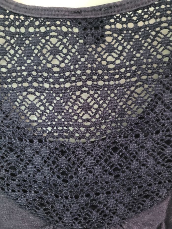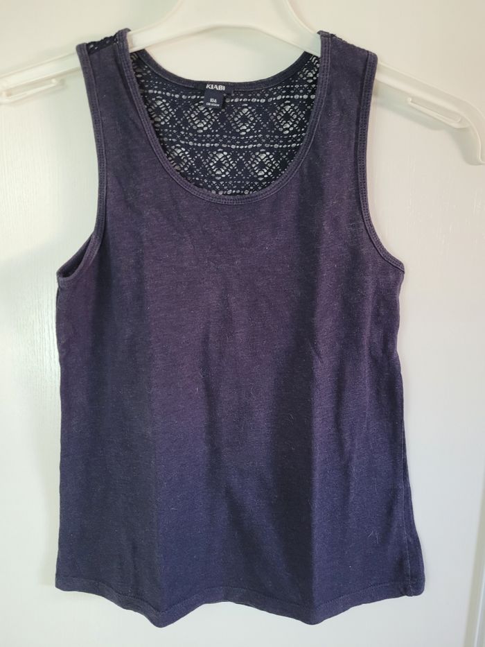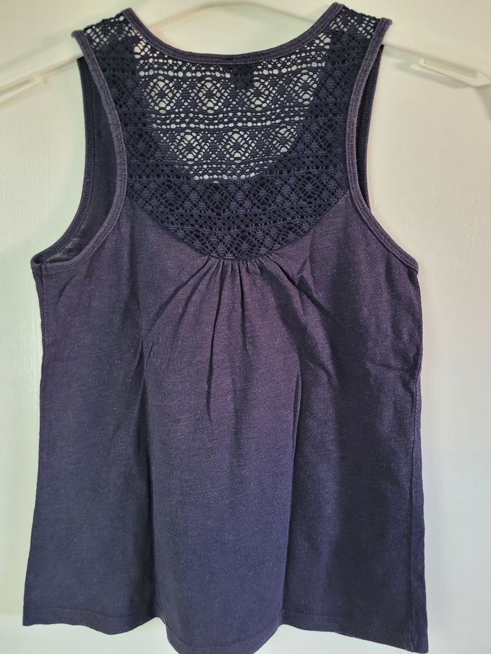 Débardeur bleu marine en très bon état. Mailles ajourées sur le haut du dos.