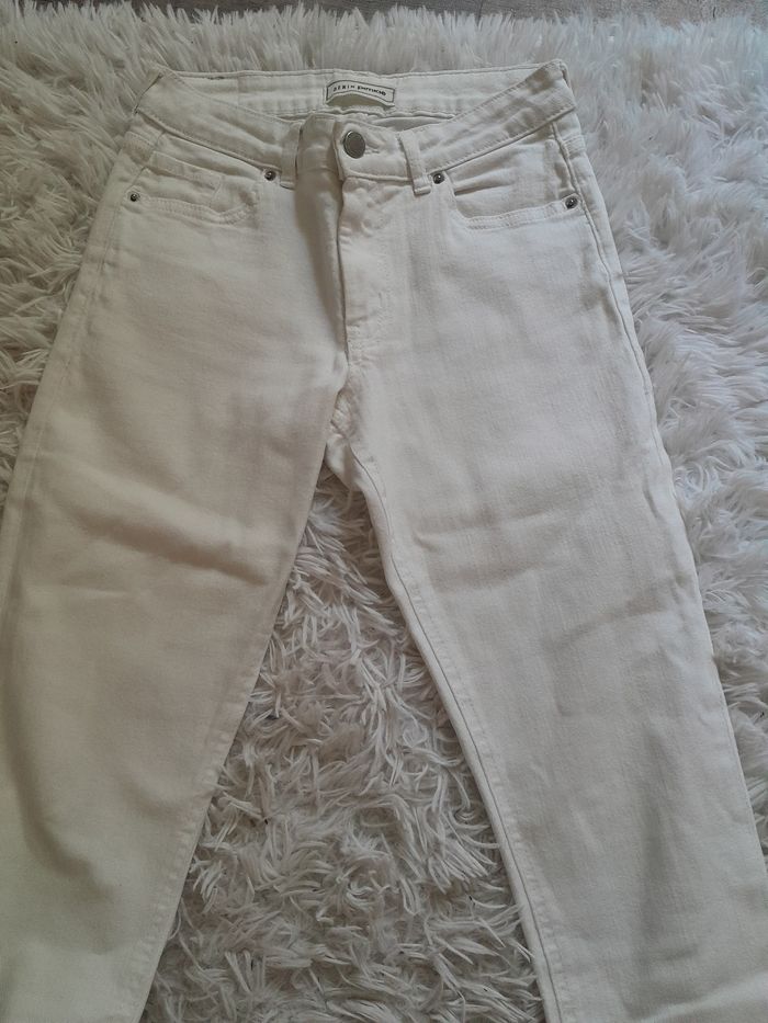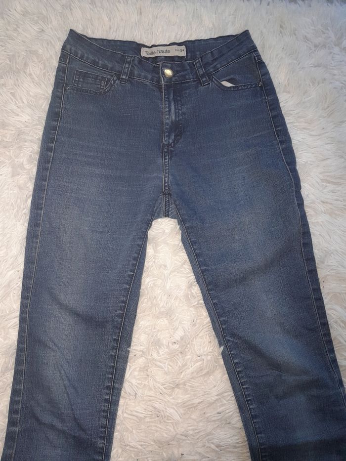 Le jeans bleu et taille haute et sur le 2eme pentalon blanc à côté du bleu il il a une toute petite tâche sur la jambe droite