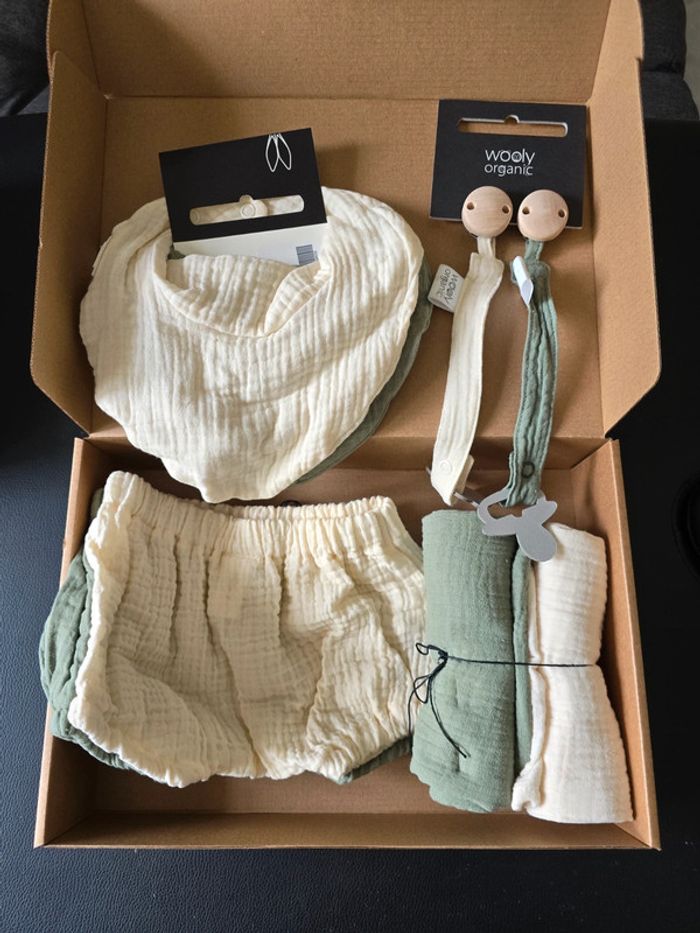 Vends coffret naissance neuf Comprend : - 1 lot de 2 bavoirs - 1 lot de 2 attaches tétines - 1 lot de 2 langes - 1 lot de 2 bloomers Choix des tailles des bloomers à préciser lors de l'achat 68/74cm (4-6mois) 74/80cm (7-9mois) Matière : mousseline coton bio Marque : Wooly Organic Prix boutique 52€