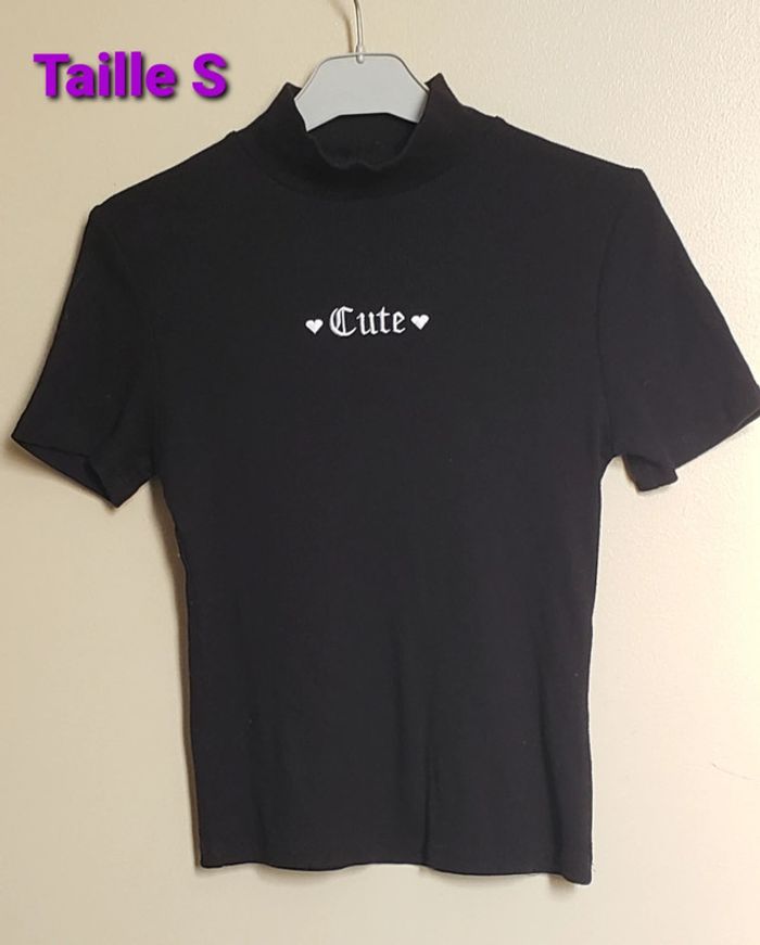 Très bon état (voir photo) Col montant 🎨 Couleur : noir avec écriture blanche 💫 Pour voir tous mes articles en taille S : #fannyfannou60_femme_taille36 #femme36 #jennyfer #hautmanchescourtes #cute