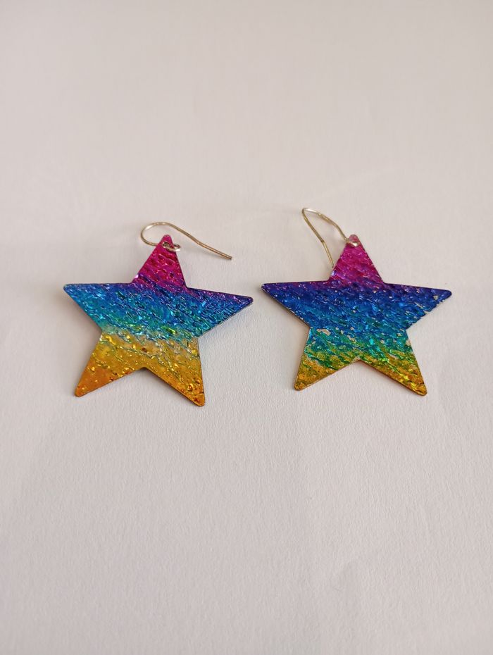 Boucles d'oreille étoiles multicolores. Matière métal gaufré. 3,7 x 3,7 cm. Très bon état.