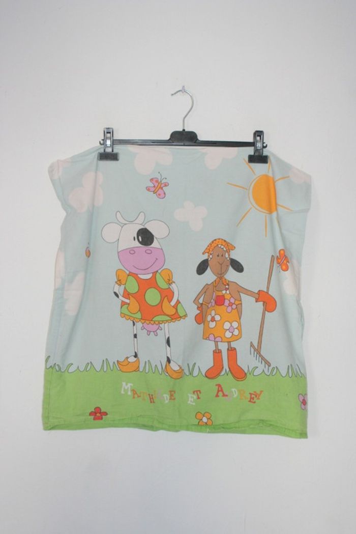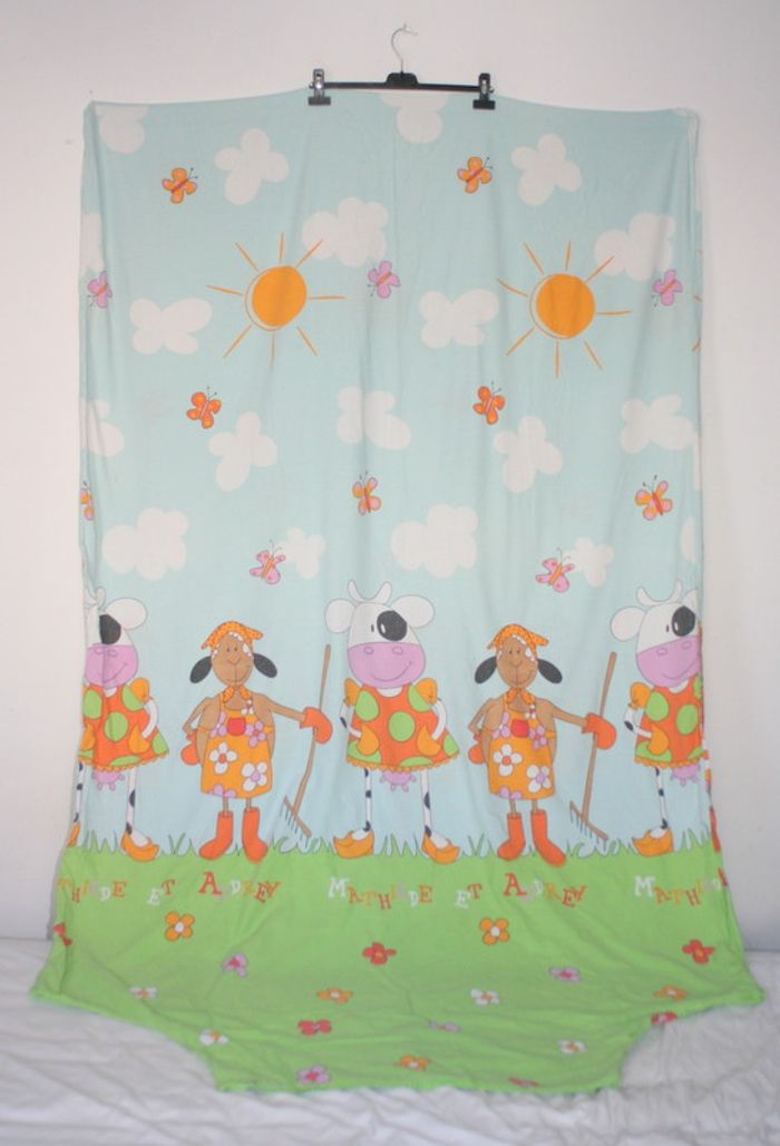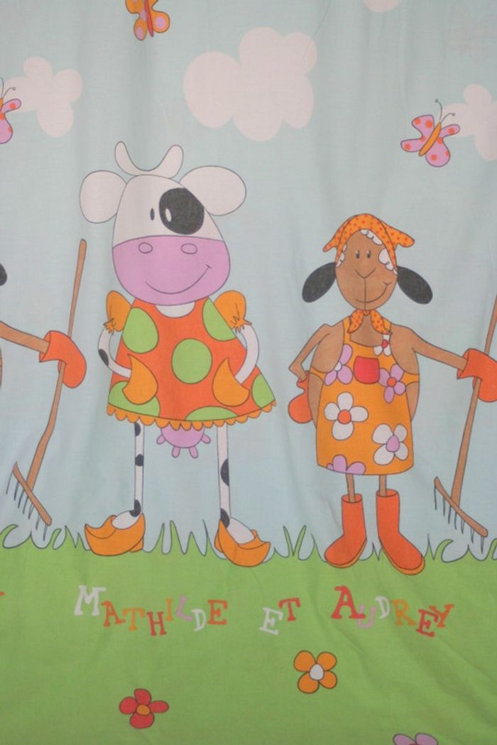 Parure Housse de couette 1 personne Mathilde & Audrey, imprimé un peu passé par le lavage, 100% coton, composé d'une housse de couette même imprimé de chaque côté + une taie d'oreiller (petit accroc sur le bas de la taie, je n'ai pas détecté d'autres défauts sur la parure mais peut-être qu'il y a des défauts tel que des petites tâches, 750g