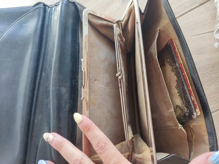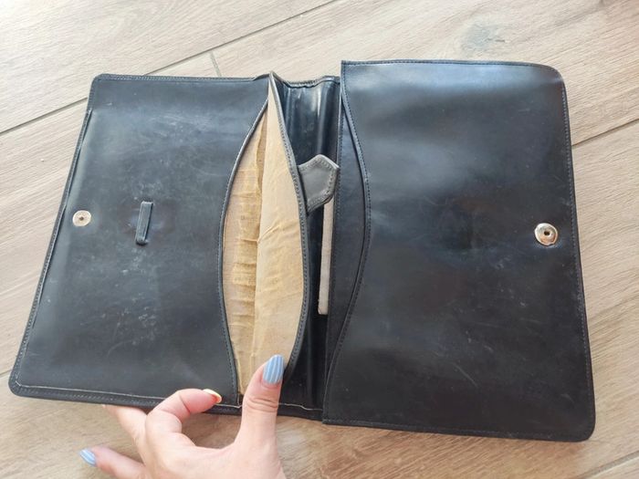 Il n'est pas tout neuf, ça se voit sur les photos ! Des traces à certains endroits l'intérieur n'est pas clean et le miroir entre parenthèses d'époque est abîmé. Mais avec un petit peu d'huile de coude on peut lui rendre son charme d'antan. Il n'y a pas de lanière il se porte à la main. #saccuirvintage #saccuir