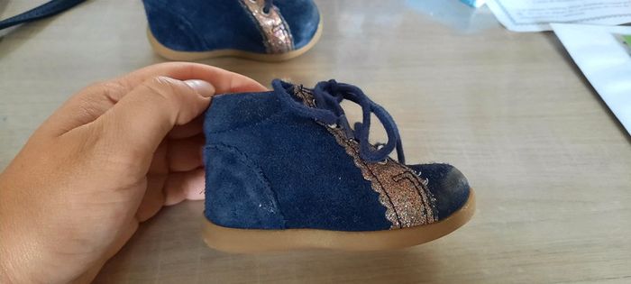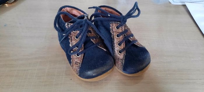 Chaussures bébé taille 17. Idéal pour débuter la marche. Tient parfaitement la cheville. Usure sur la pointe à cause du quatre pattes.